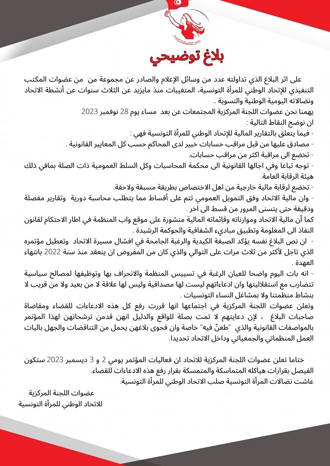 أعلن الإتحاد الوطني للمرأة انه كسب الدعوى القضائية التي رفعتها مجموعة من عضوات المكتب التنفيذي ضد المنظمة ورئيستها.