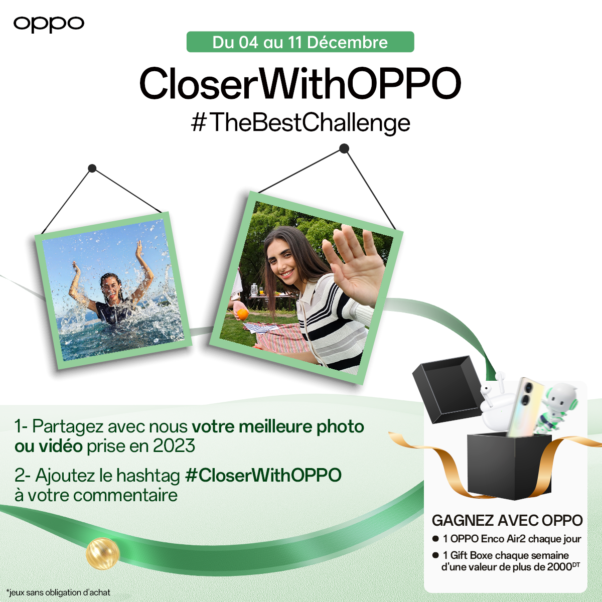 Sur Facebook, https://www.facebook.com/OPPOTunisia, un appel a été lancé aux fans en vue de partager leurs meilleures photos et vidéos prises en 2023, en ajoutant le hashtag #CloserWithOPPO aux commentaires.Cette activation fera gagner chaque jour un écouteur sans fil ENCO AIR 2aux meilleures publications gagnantes et chaque fin de semaine (durant le mois courant) un boxe d’une valeur de 2000 dinars sera octroyé, comprenant : un Reno8T 5G, un ENCO BUDS, une figurine OLLY de OPPO, une casquette UEFA, un porte-clés UEFA et un teeshirt UEFA.