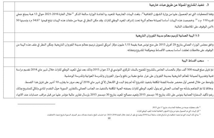 كما أن تقرير محكمة المحاسبات يشير أيضا للمنحة العمانية المخصصة لترميم جامع عقبة بن نافع و المدينة العتيقة بالقيروان بقيمة 1.5 مليون دولار أمريكي يعني حوالي 4 مليارات ونصف.