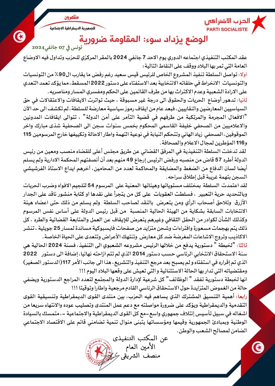 تلقت جريدة الحرية التونسية نسخة من بيان الحزب الإشتراكي الذي يقوده محمد الكيلاني، والذي قام مكتبه التنفيذي بعقد اجتماعه الدوري يوم الاحد 7 جانفي 2024 بالمقر المركزي للحزب وتم التداول فيه حول الاوضاع العامة التي تمر بها البلاد.