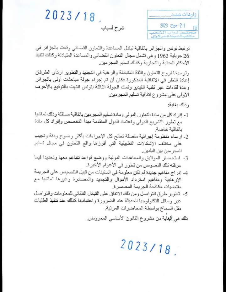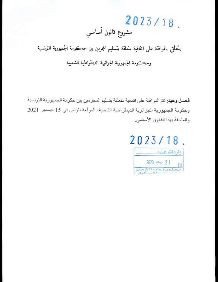 وتمت المصادقة على مشروع قانون أساسي يتعلّق بالموافقة على اتفاقية تسليم المجرمين بين حكومة الجمهورية التونسية وحكومة الجمهورية الجزائرية الديمقراطية الشعبية، عدد 18/2023 بـرمته بـ 124 نعم 02 إحتفاظ ودون رفض.
