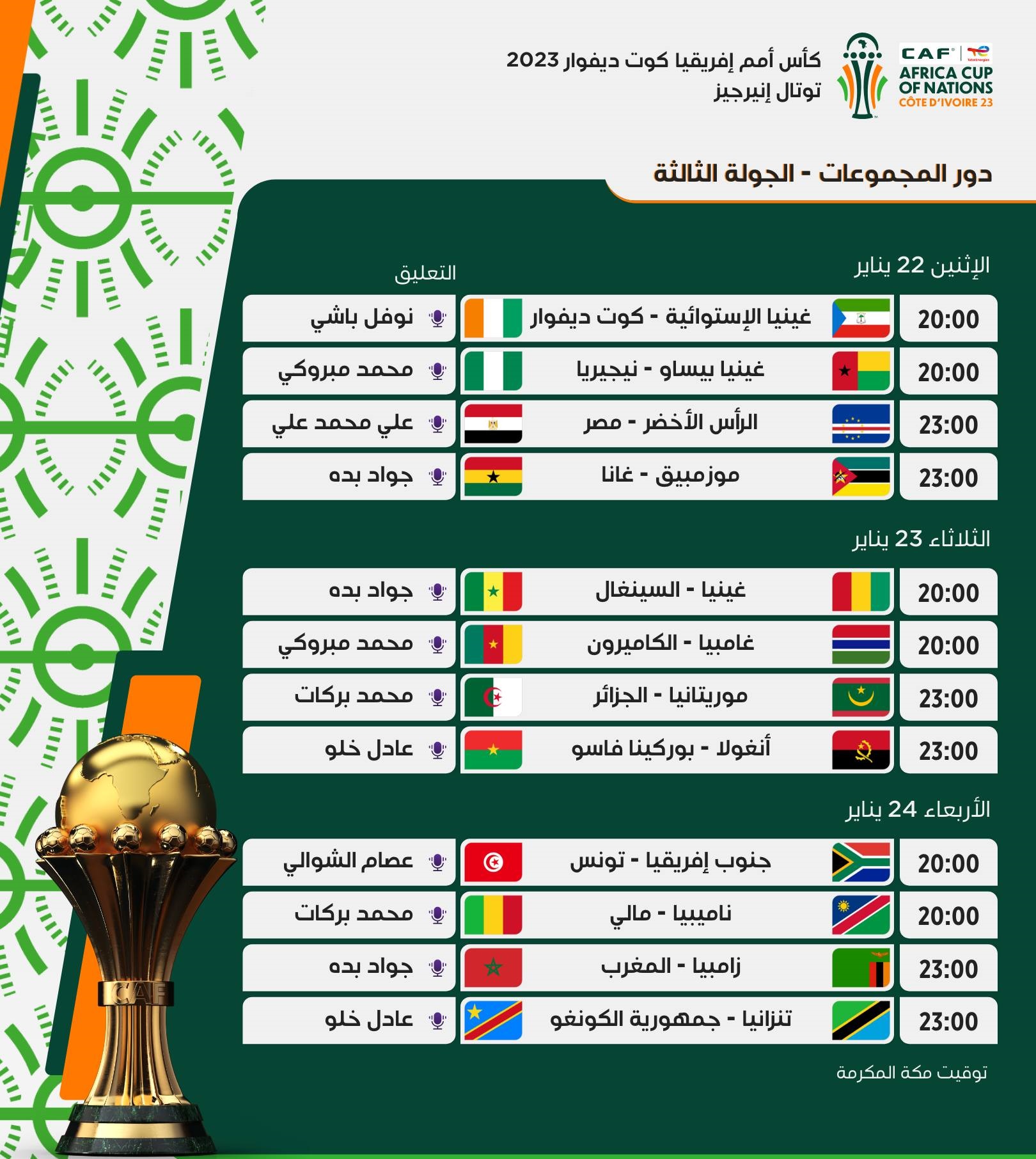 مباريات الجولة الثالثة ضمن منافسات دور المجموعات في كأس أمم إفريقيا كوت ديفوار 2023 توتال إنيرجيز.