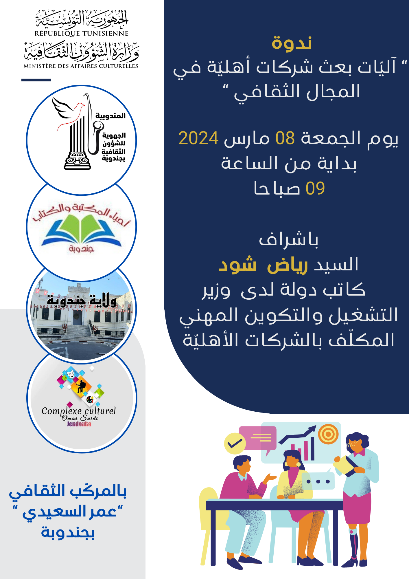 في اطار التحفيز على بعث شركات أهلية ذات صلة بالمجال الثقافي والفني والحرفي ووبادرة منها تنظّم المندوبية الجهوية للشؤون الثقافية بالشراكة مع جمعية أحبّاء المكتبة والكتاب بجندوبة صباح يوم 8 مارس القادم بفضاء المركّب الثقافي”عمر السعيدي”بجندوبة ندوة بعنوان “آليات بعث شركات أهلية في المجال الثقافي”،