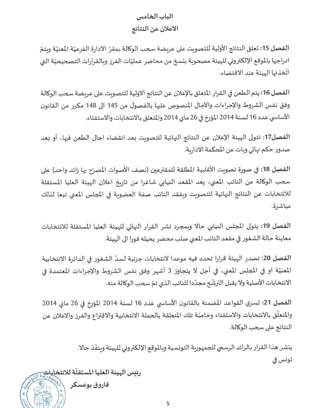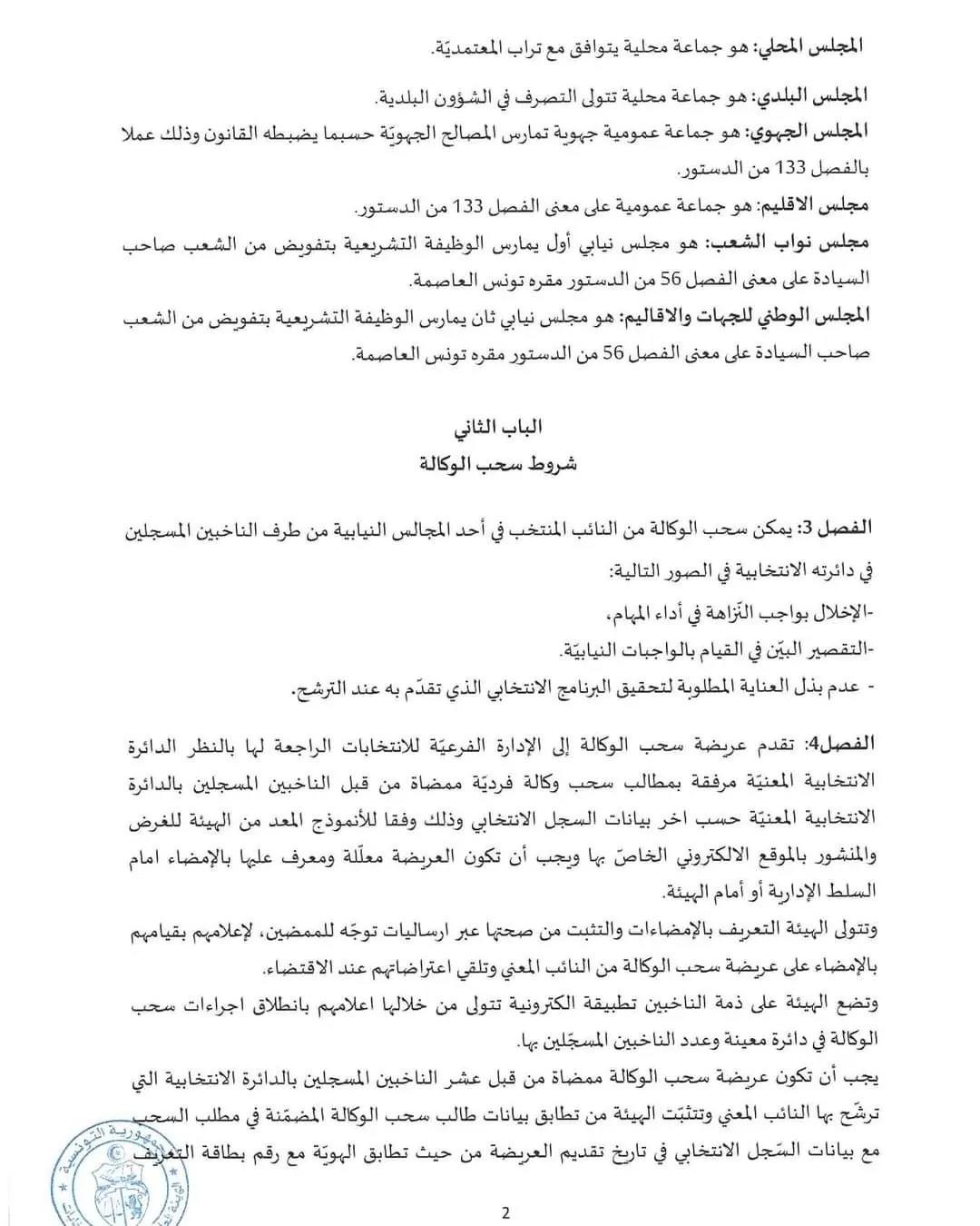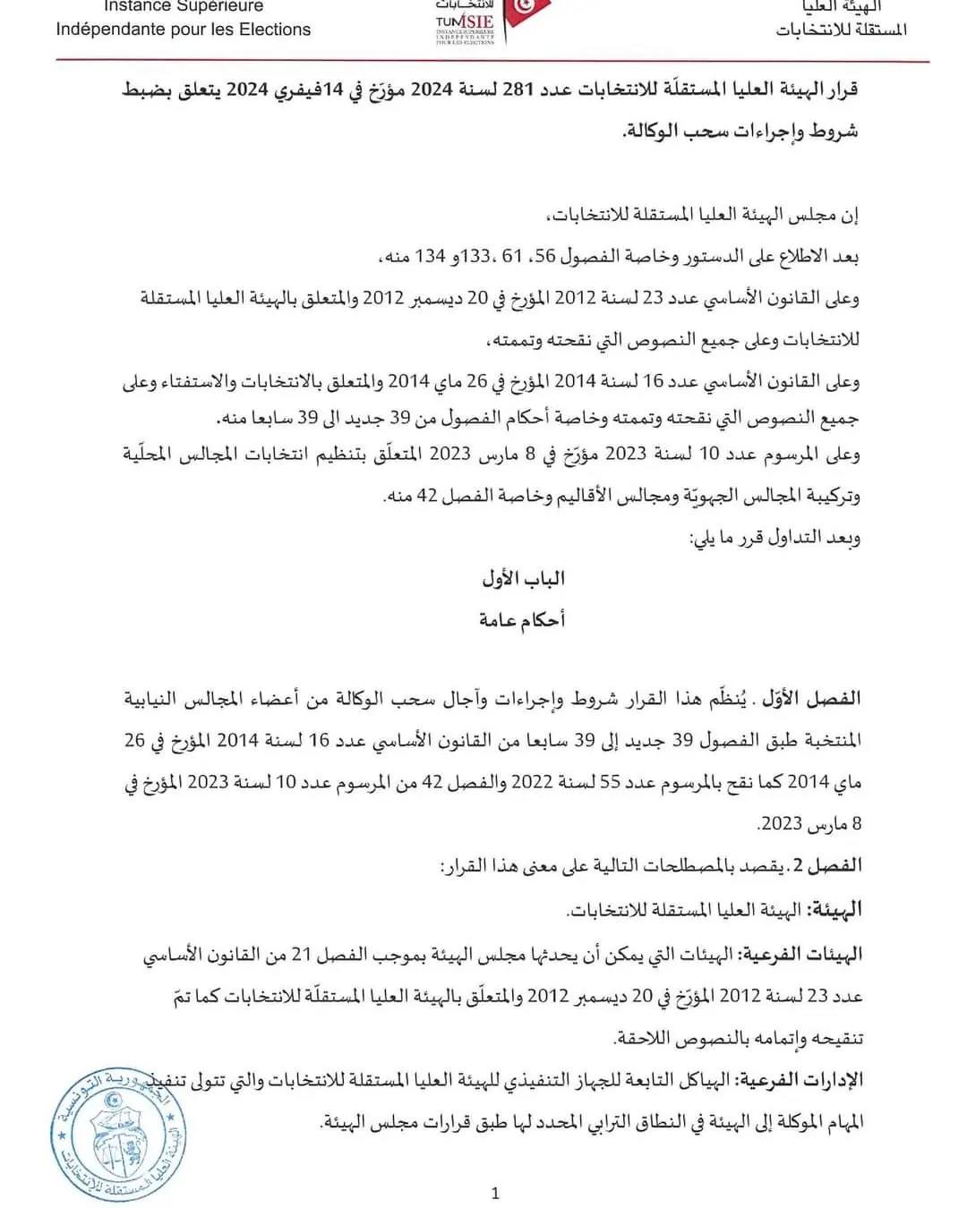 أصدرت الهيئة العليا المستقلة للانتخابات مؤخرا قرارا (عدد 281 لسنة 2024 مؤرخ في 14 فيفري) ينظم شروط واجراءت وآجال سحب الوكالة من اعضاء المجالس النيابية المنتخبة طبق الفصول 39 جديد الى 39 سابعا من المرسوم عدد 55 والمرسوم عدد 10 لسنة 2023 .