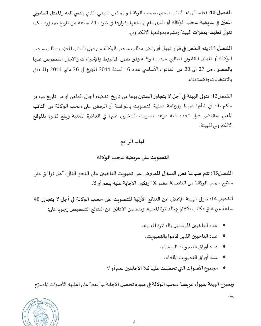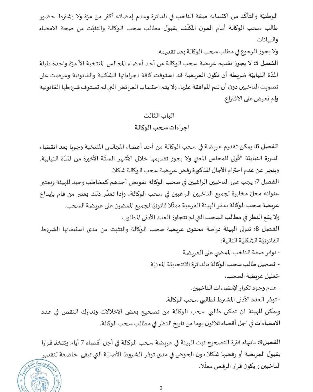 وكما قال الناطق باسم الهيئة محمد التليلي المنصري، ان اجراءات سحب الوكالة التي اعلنت عنها هيئة الانتخابات في قرارها الترتيبي عدد 281 ،جاءت مطابقة للدستور ومرسوم عدد 55 لسنة 2022 كما ان الهيئة لا تتدخل في مضمون عريضة سحب الوكالة ».