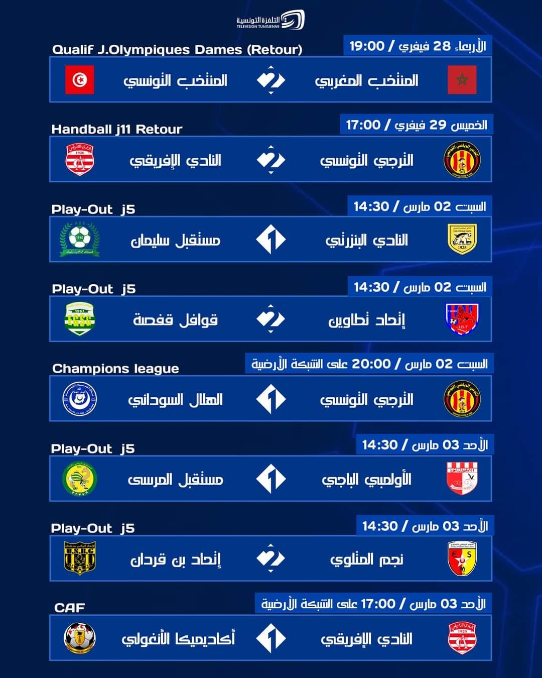 المواعيد الرياضية على التلفزة الوطنية هذا الأسبوع