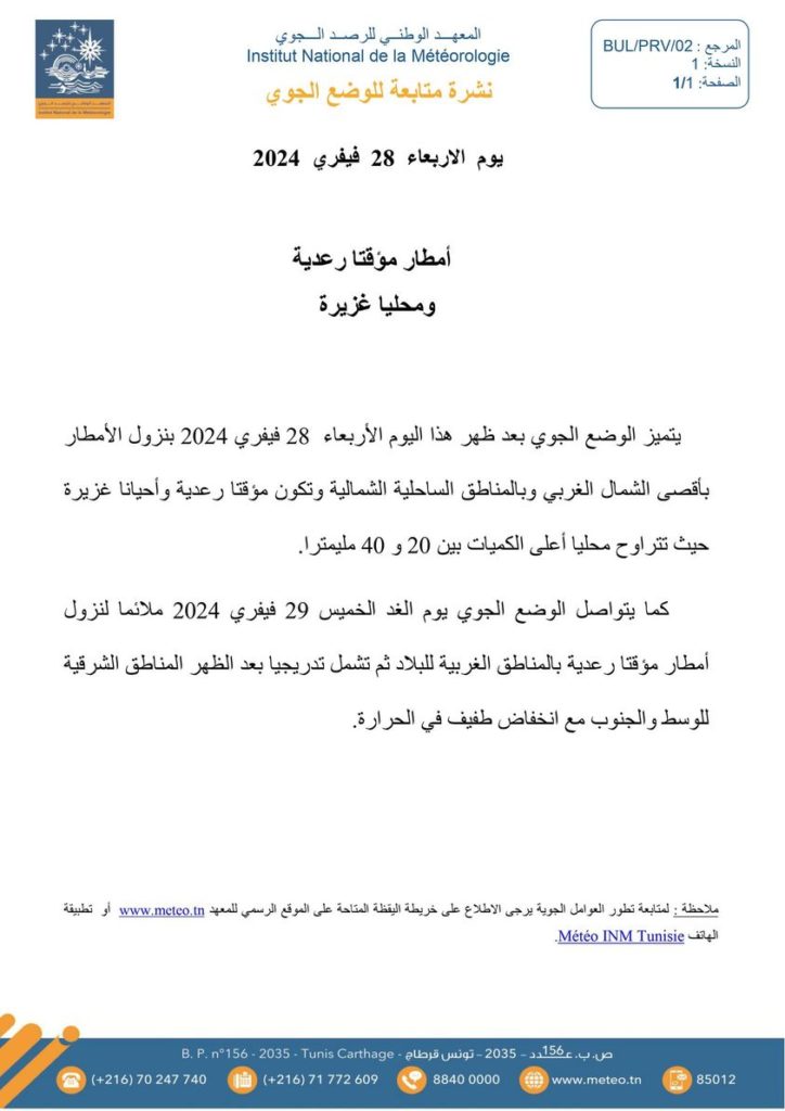 أصدر المعهد الوطني للرصد الجوي نشرة متابعة لحالة الطقس للساعات القادمة توقع فيها نزول أمطار بعد ظهر اليوم الاربعاء ستشمل أقصى الشمال الغربي وبالمناطق الساحلية الشمالية وتكون مؤقتا رعدية واحيانا غزيرة حيث ستتراوح بين 20 و40 ملم.