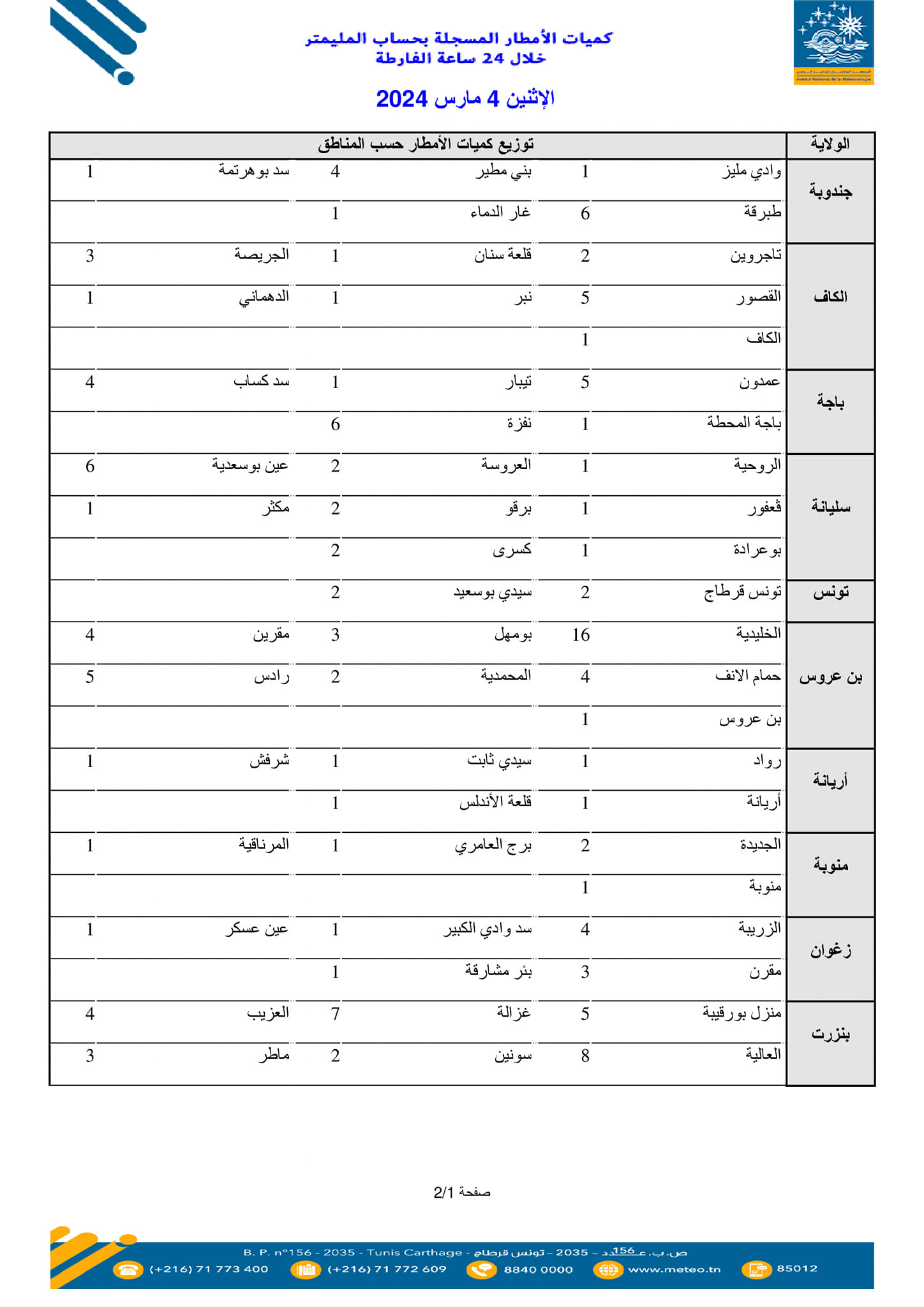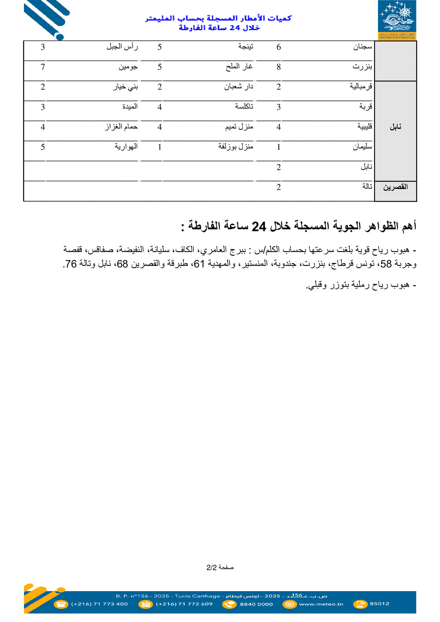 القائمة النهائية لكميات الامطار وأهم الظواهر الجوية المسجلة خلال ال24 ساعة الفارطة.