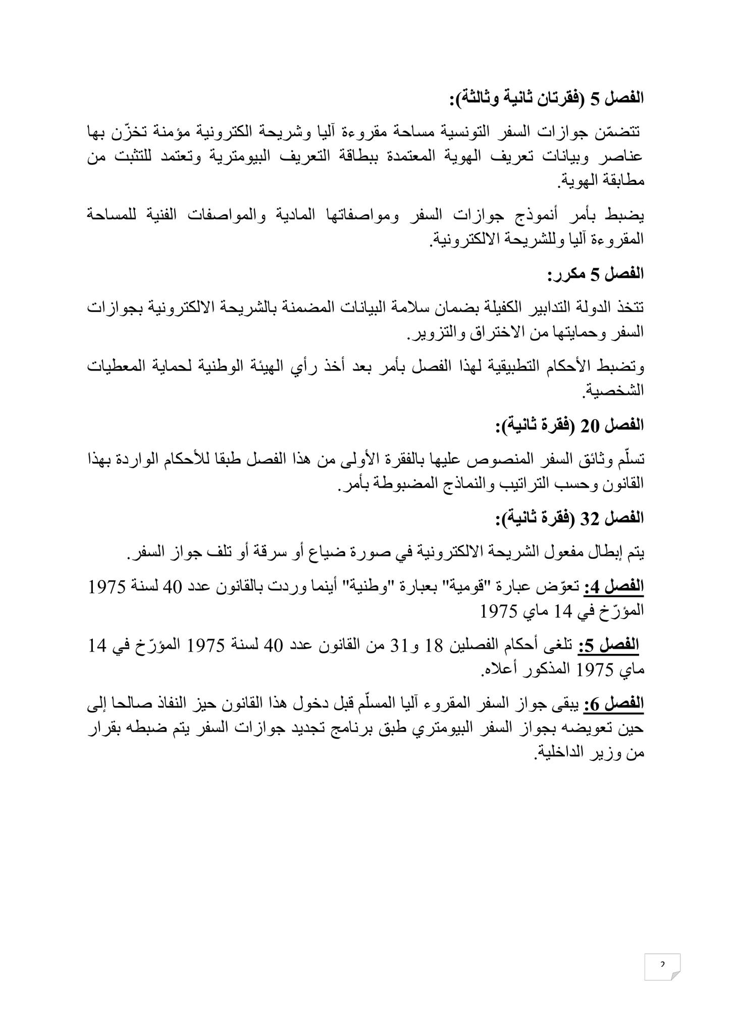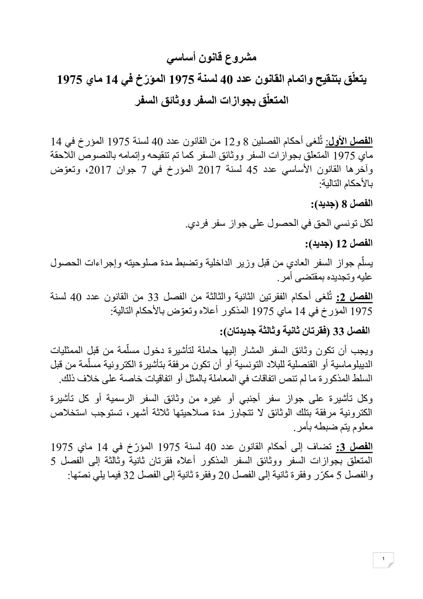 المصادقة على مشروع قانون أساسي يتعلّق بتنقيح واتمام القانون عدد 40 لسنة 1975 المؤرّخ في 14 ماي 1975 المتعلّق بجوازات السفر ووثائق السفر بــرمته بـ107 نعم 02 إحتفاظ و03 رفض.