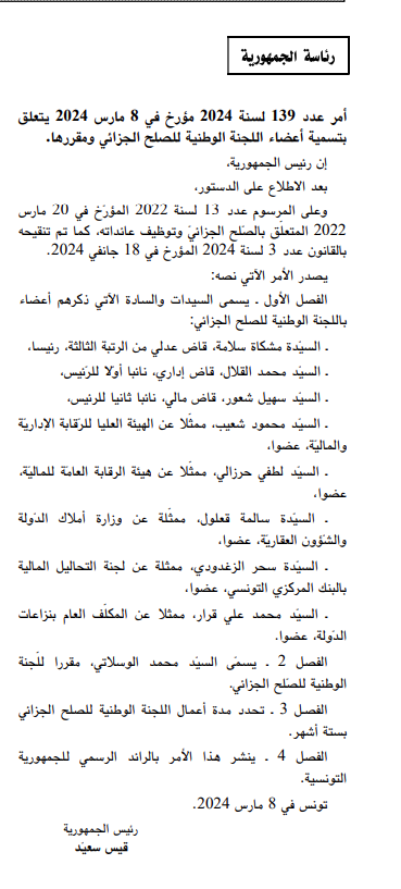 صدر بالرائد الرسمي للجمهورية التونسية في العدد الصادر اليوم الثلاثاء 12 مارس 2024، أمر رئاسي يتعلق بتسمية أعضاء اللجنة الوطنية للصلح الجزائي.