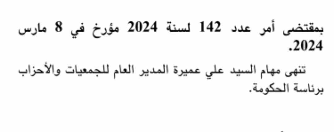 وتقّر أيضا بمقتضى أمر عدد 142 لسنة 2024، مؤرّخ في 8 مارس 2024، إنهاء مهام علي عميرة المدير العام للجمعيات والأحزاب برئاسة الحكومة.