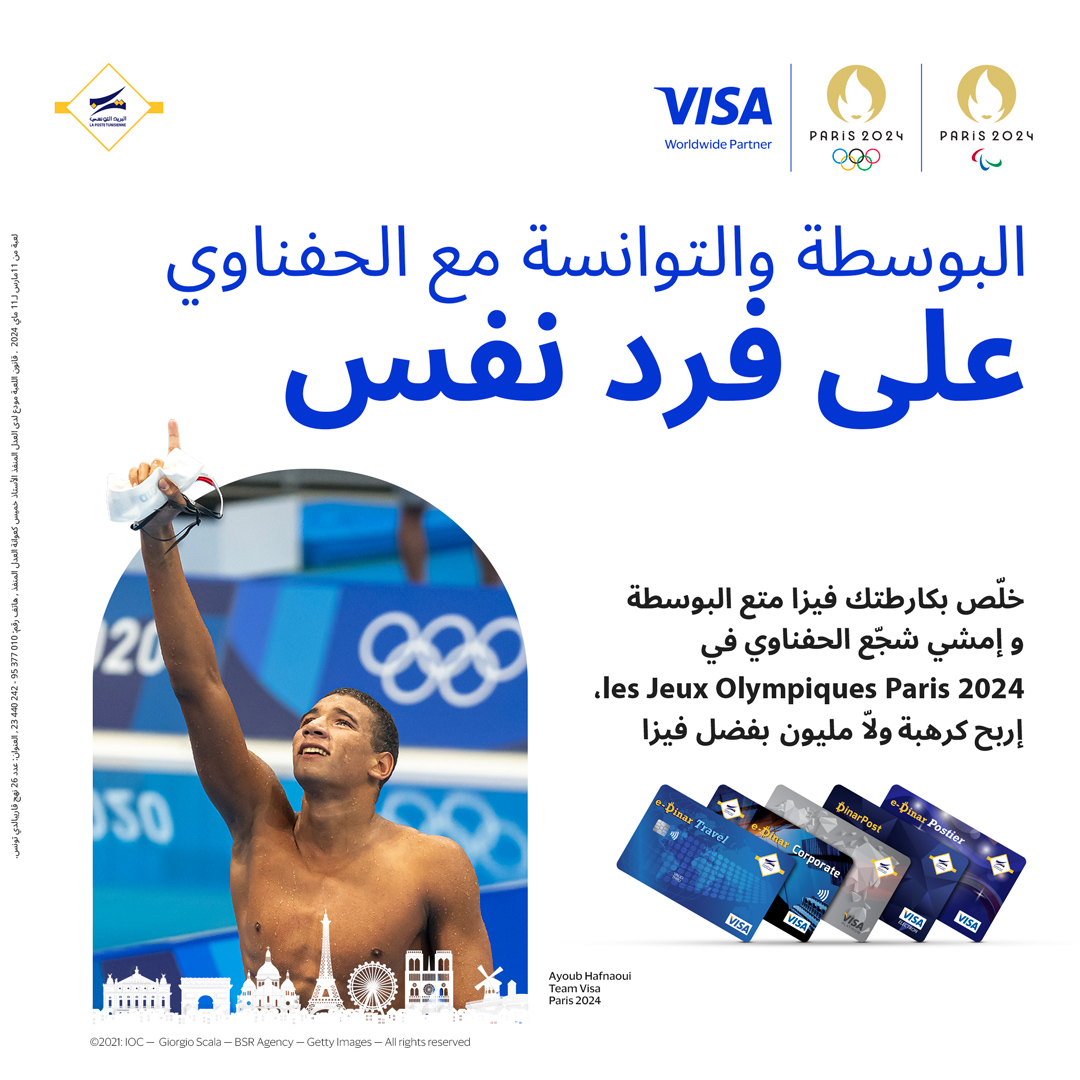 من 11 مارس لـ11 ماي 2024 خلّص بكارطتك فيزا (VISA) متاع البريد التونسي واربح رحلة لباريس باش تشجّع الحفناوي في les jeux olympiques Paris 2024
