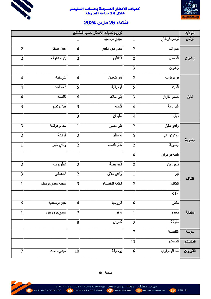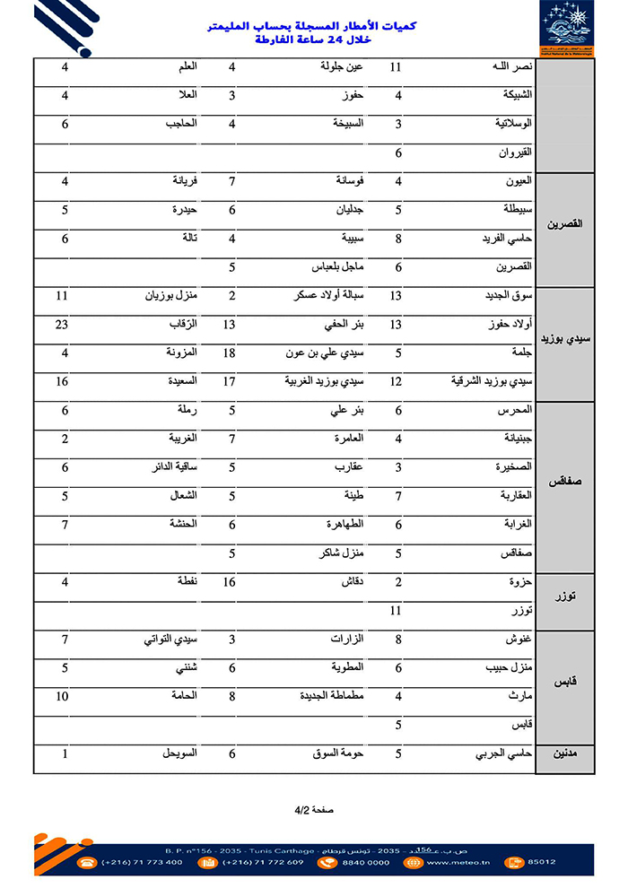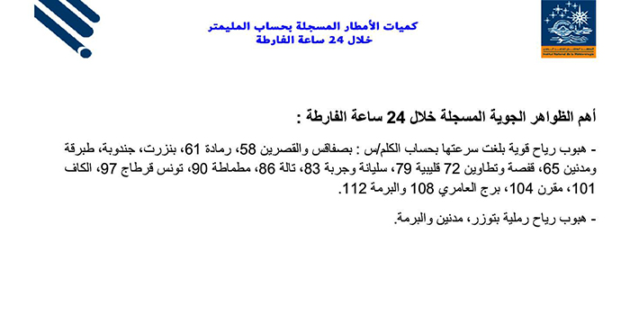 في ما يلي القائمة النّهائية، والمحيّنة، لكمّيات الأمطار المسجّلة، بحساب الملّيمتر، وفكرة عن أهمّ الظّواهر الجوّية خلال الـ24 ساعة الماضية: