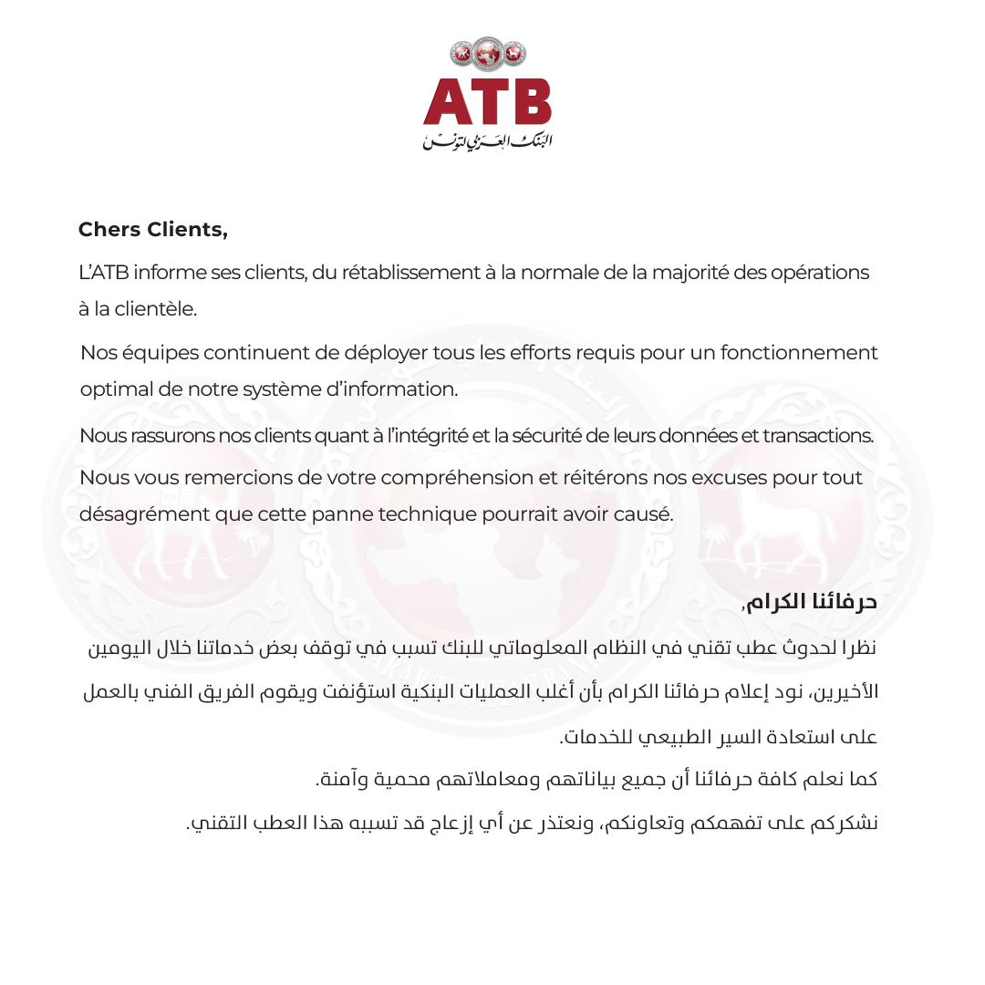 وقد تم إعلام الحرفاء بأن أغلب العمليات البنكية استؤنفت ويقوم الفريق التقني بالعمل على إستعادة السير الطبيعي للخدمات، كما ان جميع بيانات الحرفاء ومعاملاتهم محمية وآمنة.