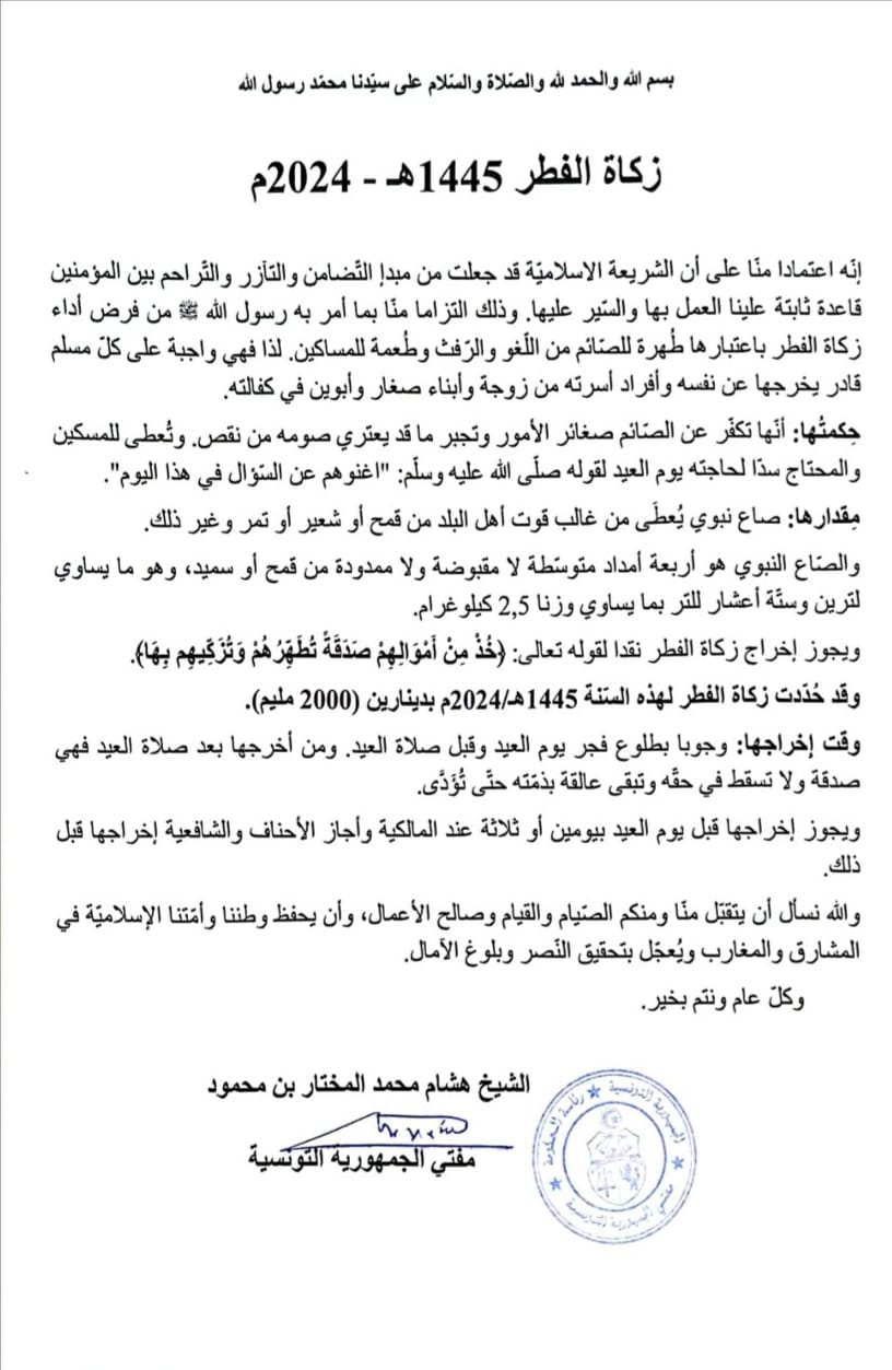 أعلن مفتي الجمهورية التونسية اليوم الأربعاء، أنّ قيمة زكاة الفطر لهذا العام 1445 هجري/2024 حددت بدينارين اثنين (2000 مليم).