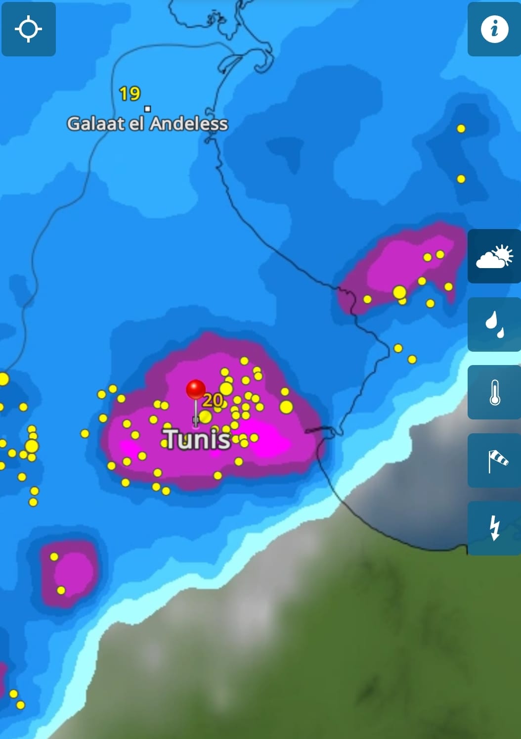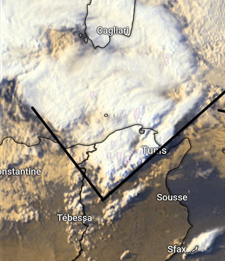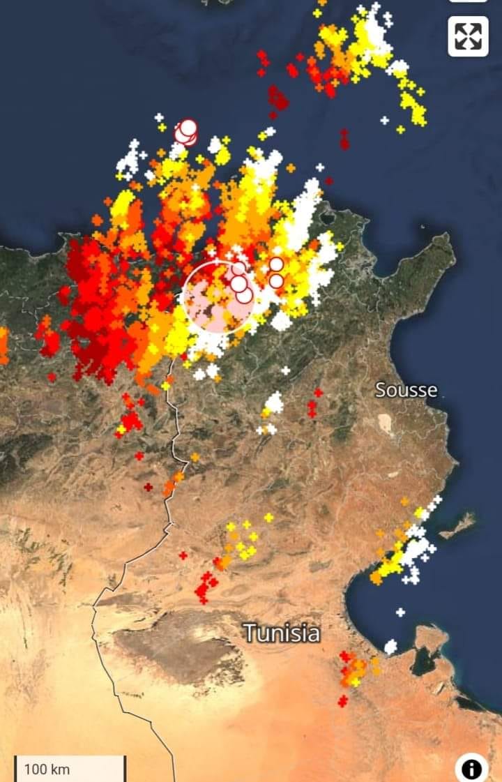 وكما تسجيل نشاط رعدي كثيف حاليا على مناطق الشمال خاصة ولايات تونس الكبرى و بنزرت و باجة و جندوبة و شمال ولايات الكاف و سليانة و زغوان.
