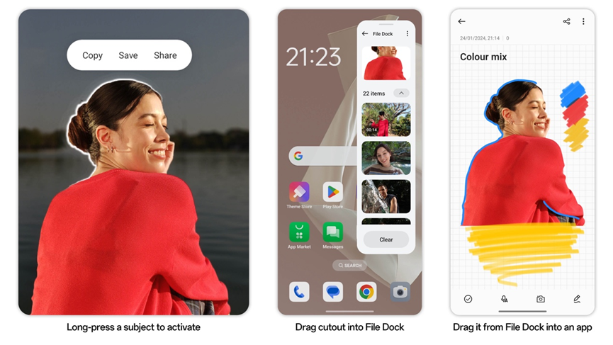 وباستخدام وظيفةFile Dock، يمكنك حفظ الصّور أو النّصوص أو الملفّات بسهولة. اما تقنية SmartTouch فهي تمكّن من التقاط الصور والنّصوص وحتّى النصوص الموجودة في الصّور. ويمكن لتقنية Smart Image Matting من تجزئة الصورة إلى ستة عناصربسهولة وحفظها في File Dock .