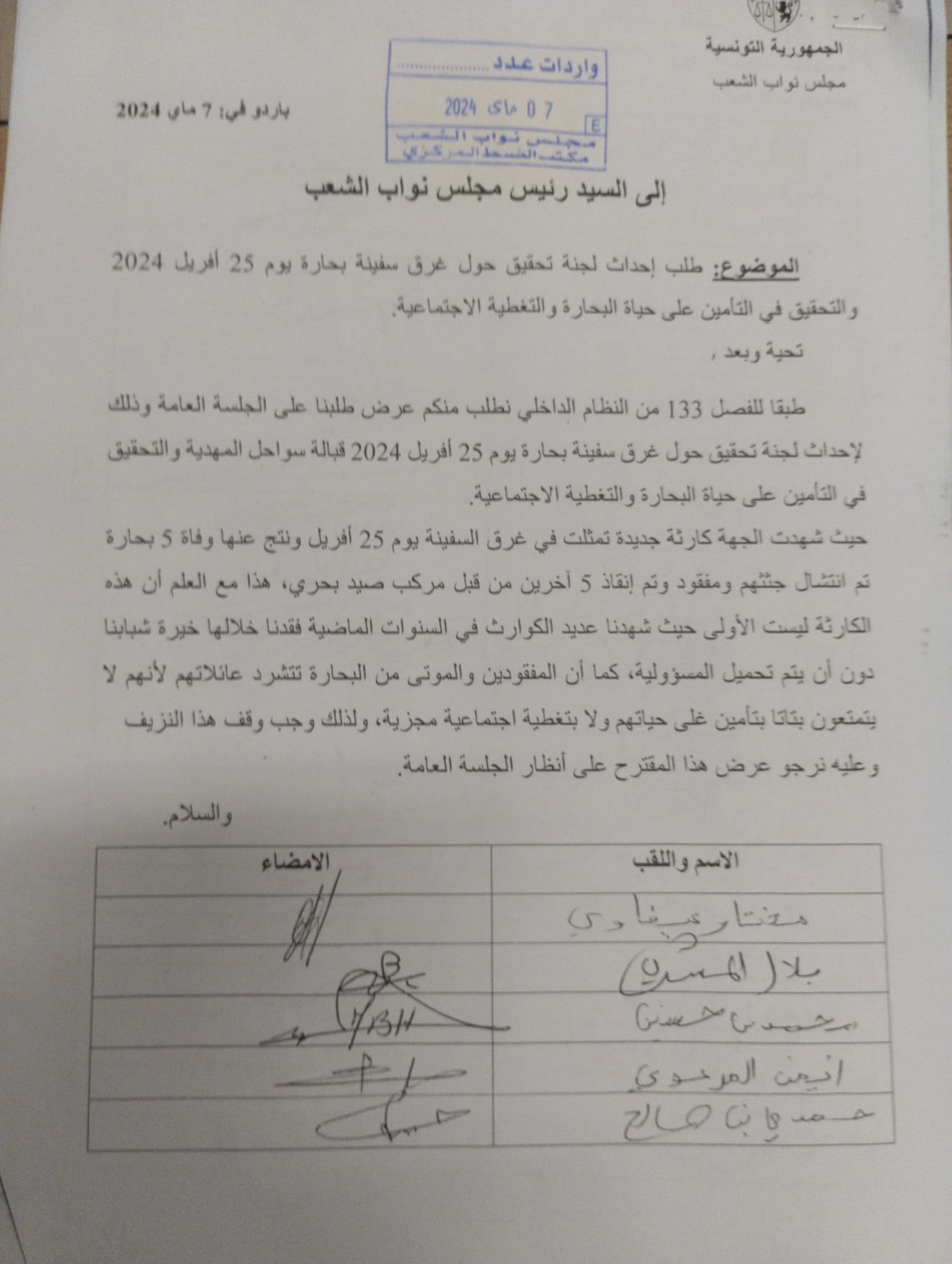 تقدم اليوم أكثر من 50 نائب بمجلس نواب الشعب بطلب إحداث لجنة تحقيق برلمانية حول غرق سفينة البحارة بولاية المهدية يوم 25 أفريل 2024 و تأمين حياة البحارة و التغطية الإجتماعية للبحارة .