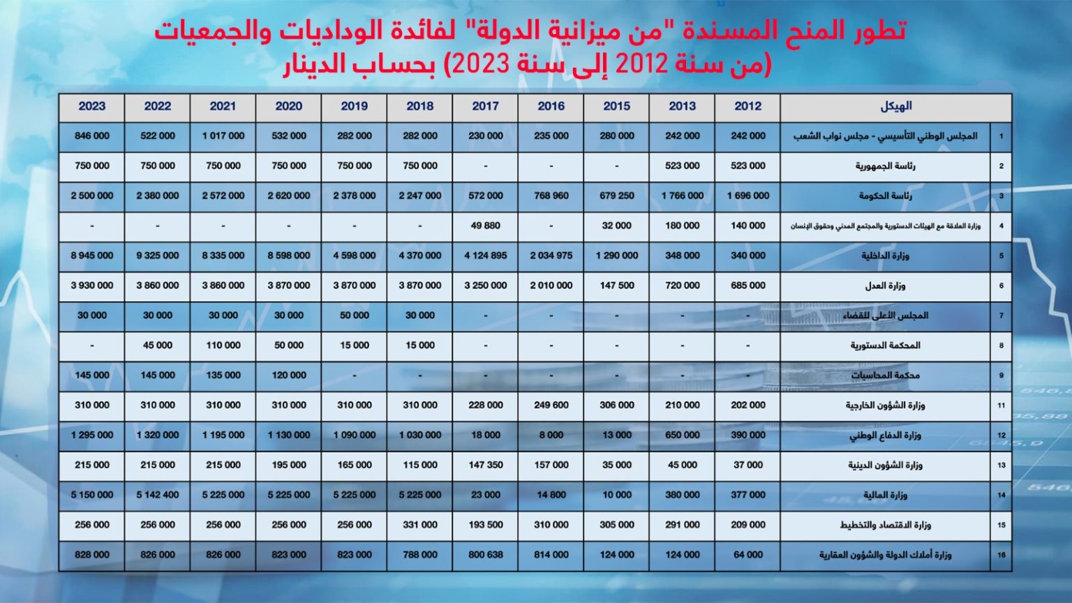 أثبتت التّقارير الصادرة عن وزارة المالية المُتعلقة بالمنح المُسندة للوداديات والجمعيّات أنَّ​ المنح المسندة من ميزانية الدولة لفائدة الجمعيات والوداديات فاقت 1000 مليون دينار خلال الفترة الممتدة من سنة 2012 إلى غايةِ سنة 2023 حيث تم اعتماد معدل مجموع المنح المُسندة بالنسبة لسنة 2014 و ذلك بحسب ما جاء في تقرير لمرصد رقابة تحت عنوان التّمويلُ العموميّ للوداديّات والجَمعيات.
