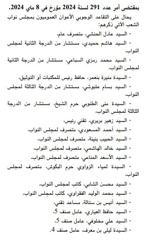 صدر بالعدد الأخير من الرائد الرسمي للجمهورية التونسية اليوم الجمعة 10 ماي 2024 الأمر عدد 291 لسنة 2024 مؤرخ يوم 8 ماي والقاضي بإحالة 18 عونا من أعوان مجلس نواب الشعب، وفيما يلي نص الأمر: