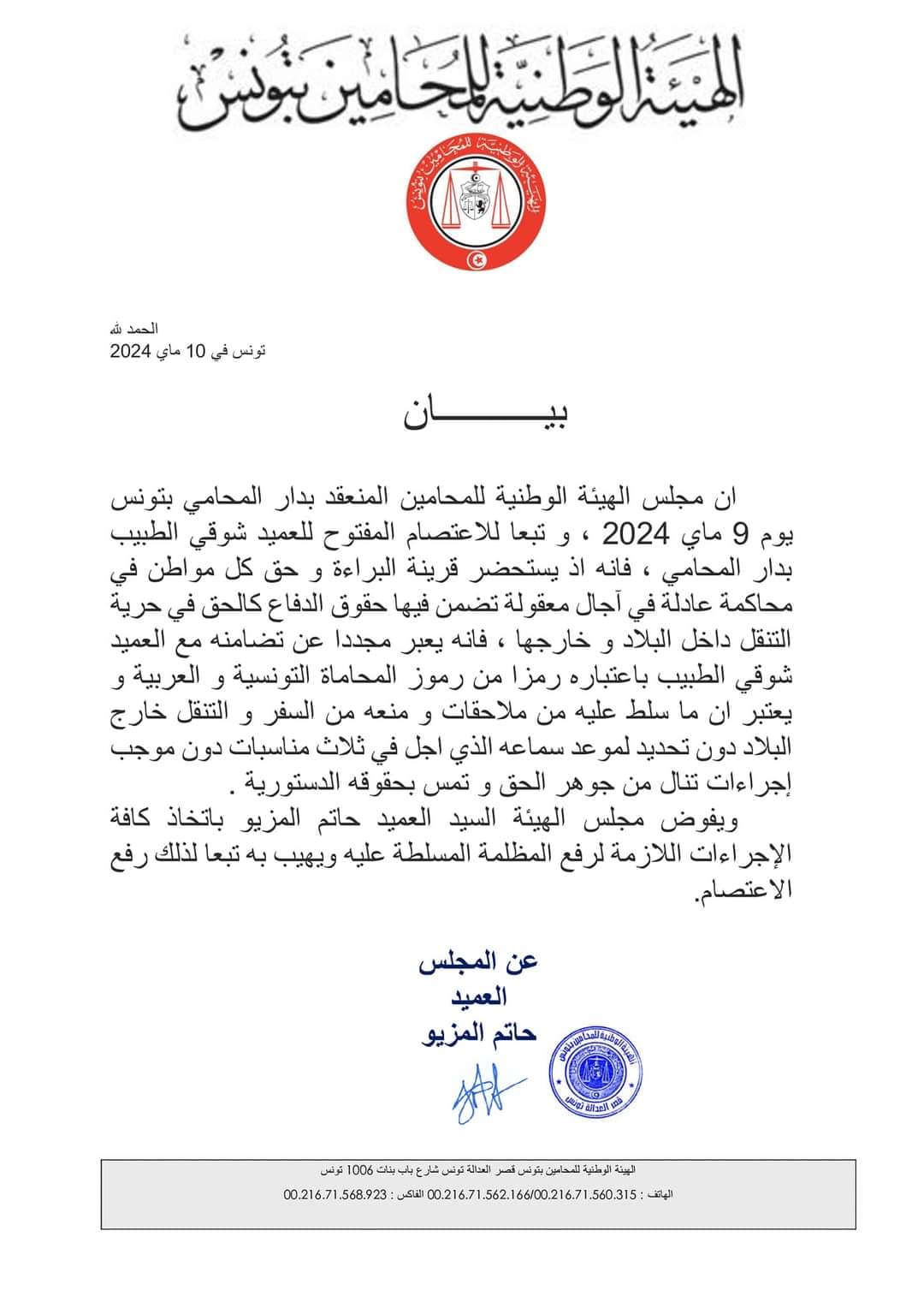 أصدر مجلس الهيئة الوطنية للمحامين بيانا عقب إجتماعها المنعقد بدار المحامي بتونس يوم 9 ماي 2024، وذلك لتناول موضوع الإعتصام المفتوح للعميد شوقي الطبيب بدار المحامي.