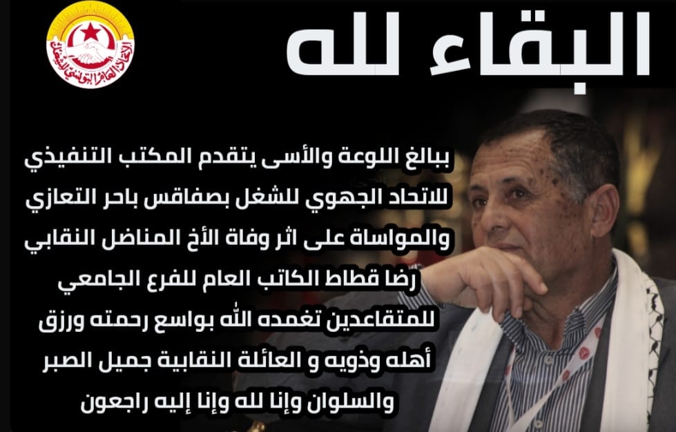أعلن الإتحاد الجهوي للشغل بصفاقس عن وفاة الكاتب العام للفرع الجامعي للمتقاعدين، رضا قطاطا،
