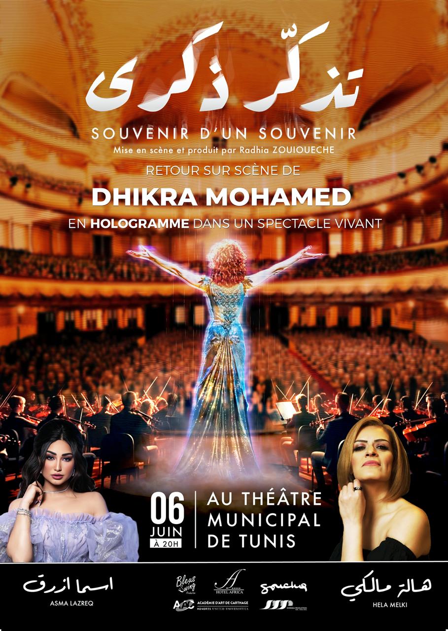 تحت عنوان”تذكر ذكرى”، تعيش الساحة الموسيقية حدثا جديدا ومهما بعودة الفنانة الراحلة ذكرى محمد للغناء على ركح المسرح البلدي بالعاصمة من خلال حفل تكريمي يعيد إحياء أسطورة الغناء العربي للذاكرة بعد عقدين من الزمن على رحيلها وذلك من خلال حفل فني عبر تقنية الهولوغرام ينتظم يوم 6 جوان المقبل.