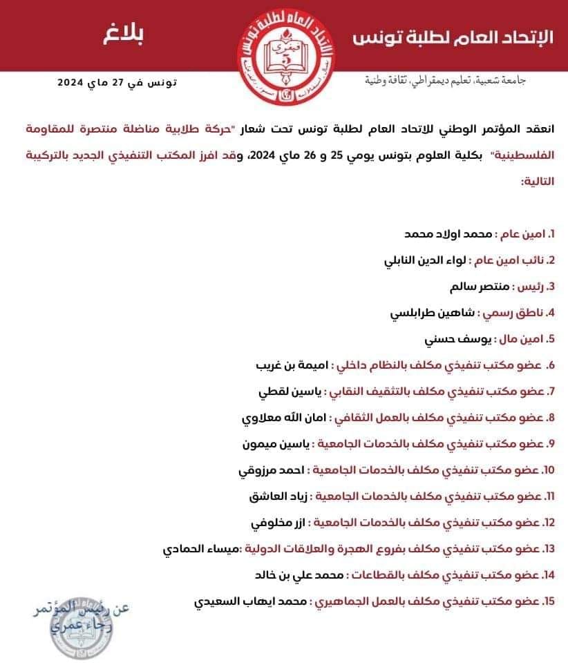 انعقد المؤتمر الوطني للاتحاد العام لطلبة تونس تحت شعار “حركة طلابية مناضلة منتصرة للمقاومة الفلسطينية” بكلية العلوم بتونس يومي 25 و 26 ماي 2024، وقد افرز المكتب التنفيذي الجديد بالتركيبة التالية: