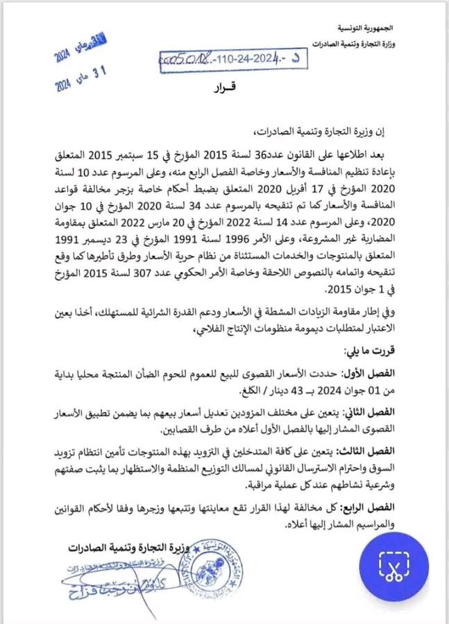 تحديد الأسعار القصوى للبيع للعموم للحوم الضأن المنتجة محليا بداية من 1 جوان 2024، بـ 43 دينار للكيلو.