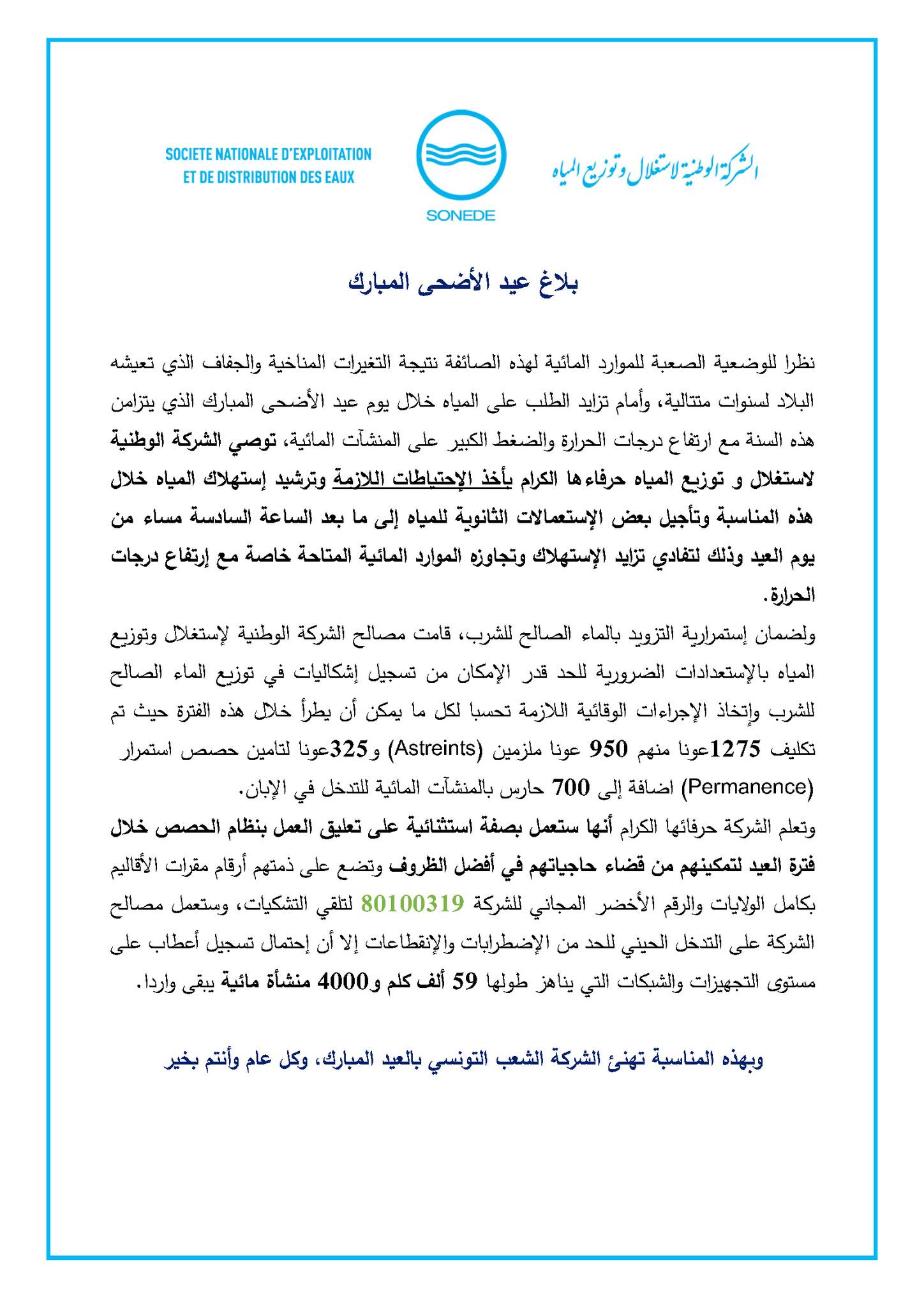 أصدرت الشركة التونسية لإستغلال وتوزيع المياه بلاغاً هاماً بمناسبة عيد الإضحى المبارك، وأشارت الشركة للوضعية الصعبة للموارد المائية لهذه الصائفة نتيجة التغيرات المناخية والجفاف الذي تعيشه البلاد التونسية لسنوات متتالية.