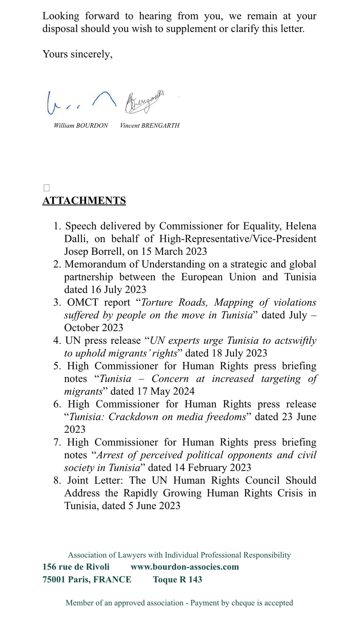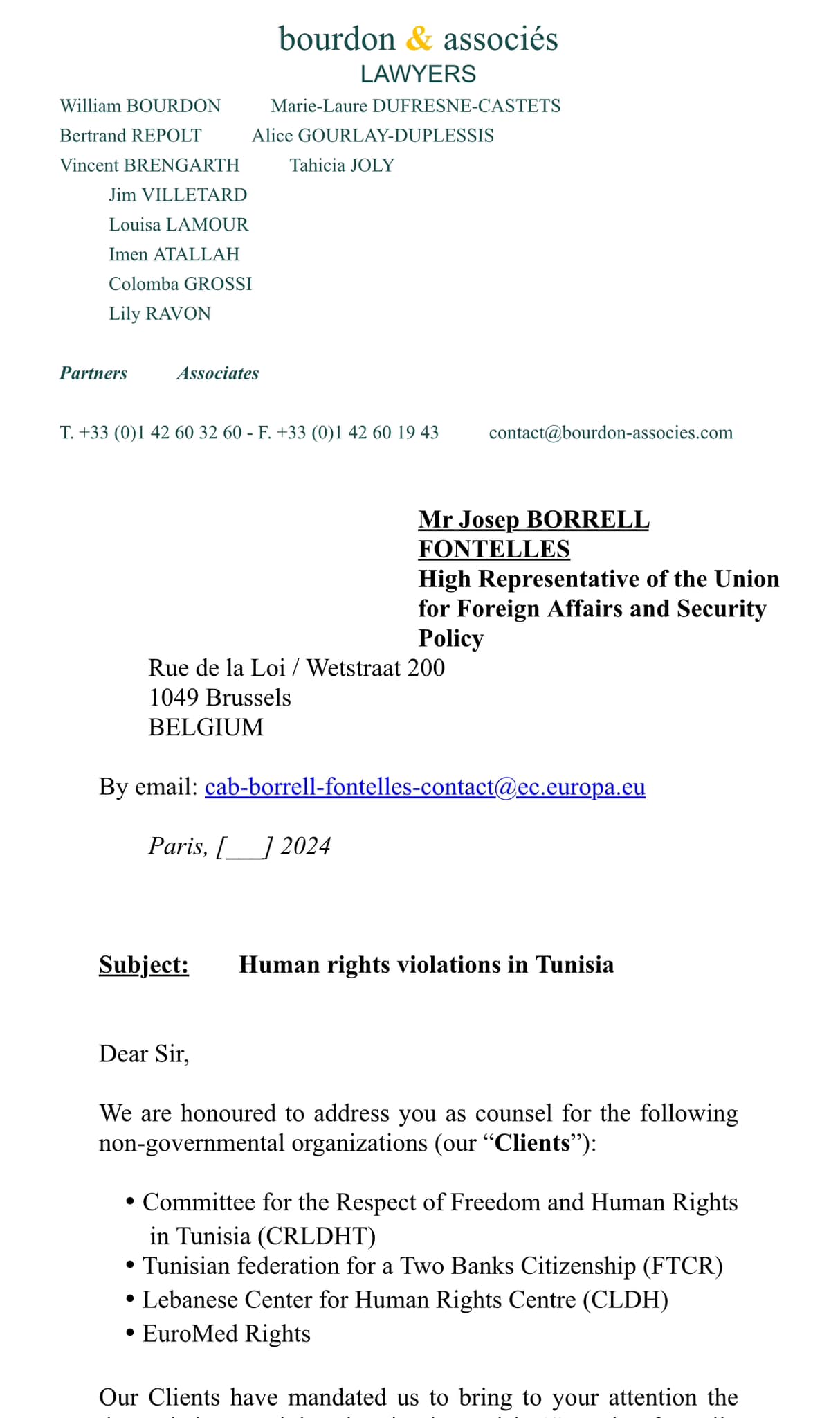 في هذه الوثيقة المؤلفة من 11 صفحة، يقدم مكتب المحاماة لرئيس الدبلوماسية الأوروبية عرضا حول ما قال عنه: تدهور حالة الحريات العامة في تونس منذ 25 جويلية 2021. مع التذكير بالاتفاقيات الموقعة بين الاتحاد الأوروبي وتونس، ولا سيما مذكرة التفاهم حول شراكة استراتيجية وعالمية (جويلية 2023)، والتي لها قيمة اتفاقية دولية، وهي ملزمة للطرفين.