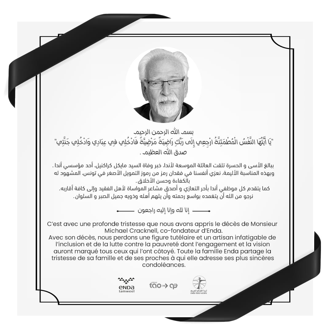 وقد تقدمت المنظمة ببالغ عبارات الأسى و الحسرة بعد تلقيها، خبر وفاة مايكل كراكنيل، أحد مؤسسي أندا. وبهذه المناسبة الأليمة، بفقدان رمز من رموز التمويل الأصغر في تونس، المشهود له بالكفاءة وحسن الأخلاق، تقدم كل موظفي أندا بأحر التعازي و أصدق مشاعر المواساة لأهل الفقيد وإلى كافة أقاربه.