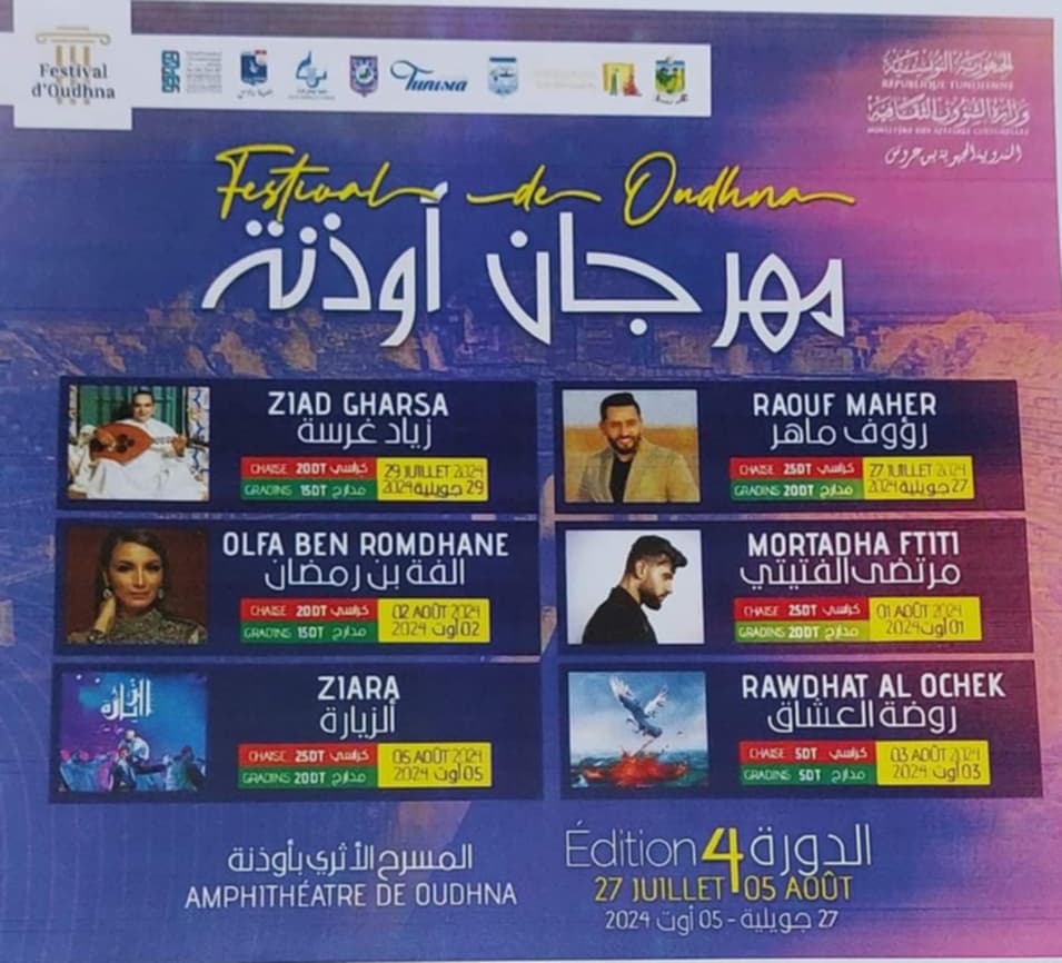 في اطار تنشيط جهة بنعروس تنتظم خلال الفترة الممتدة بين 27جويلية و5اوت 2024 المهرجان الدولي بأوذنة بمنطقة الخليدية معتمدية مرناق في دورته الرابعة.