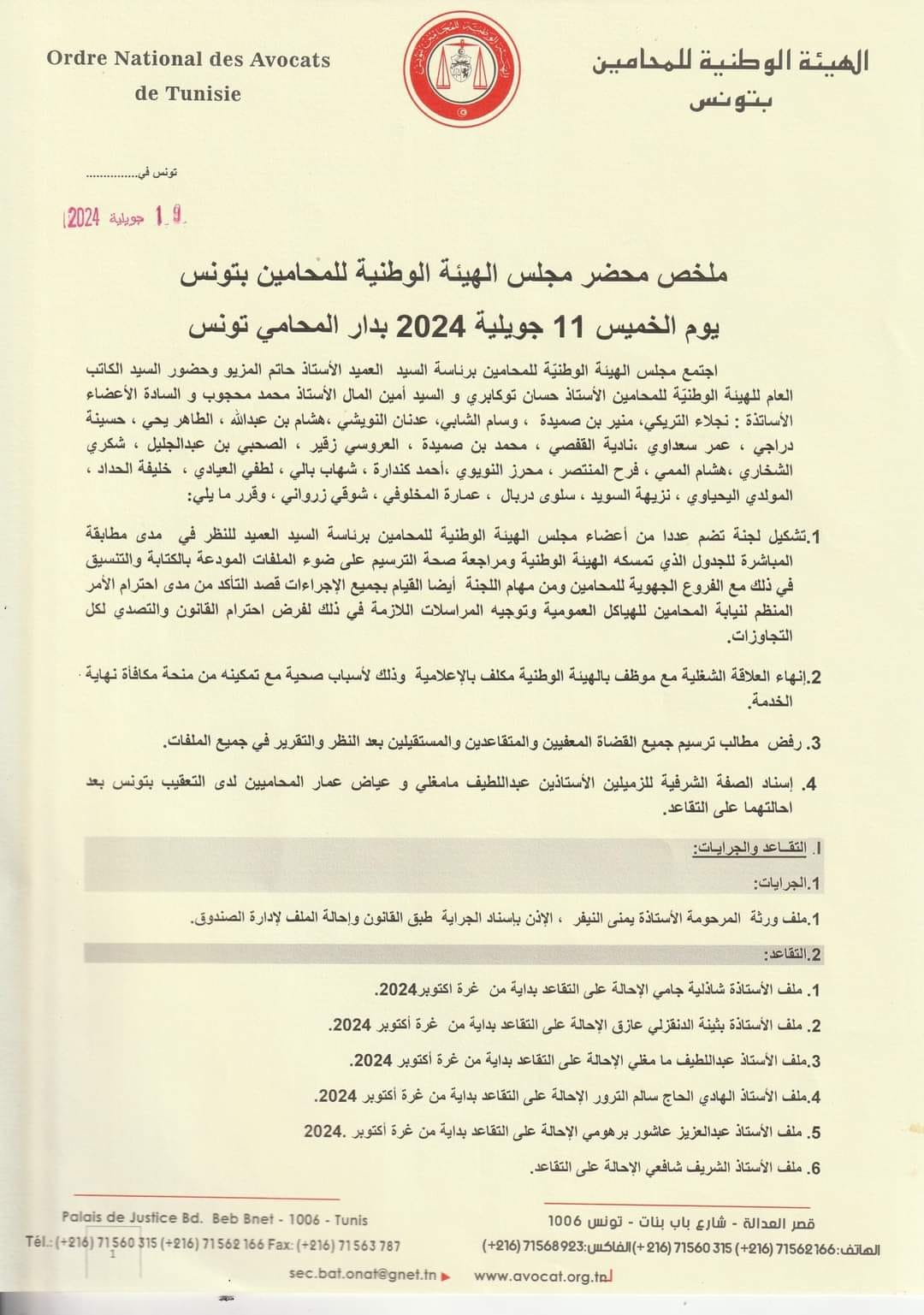 أفادت الهيئة الوطنية للمحامين في بلاغ لها اليوم الجمعة 19 جويلية 2024 بأنه تقرر عقب اجتماع مجلسها برئاسة العميد حاتم المزيو بتاريخ 11 جويلية تقرر رفض مطالب ترسيم جميع القضاة المعفيين والمستقيلين والمتقاعدين بعد دراسة جميع ملفاتهم (النظر والتقرير في كل ملف على حدة).