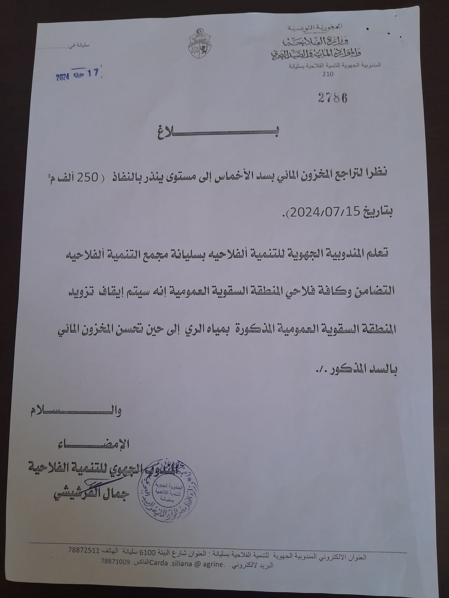 أعلنت المندوبية الجهوية للتنمية الفلاحية بسليانة أنه سيقع إيقاف تزويد المنطقة السقوية العمومية التابعة لمجمع التنمية الفلاحية التضامن من مياه الري، إلى حين تحسين المخزون المائي بالسد.