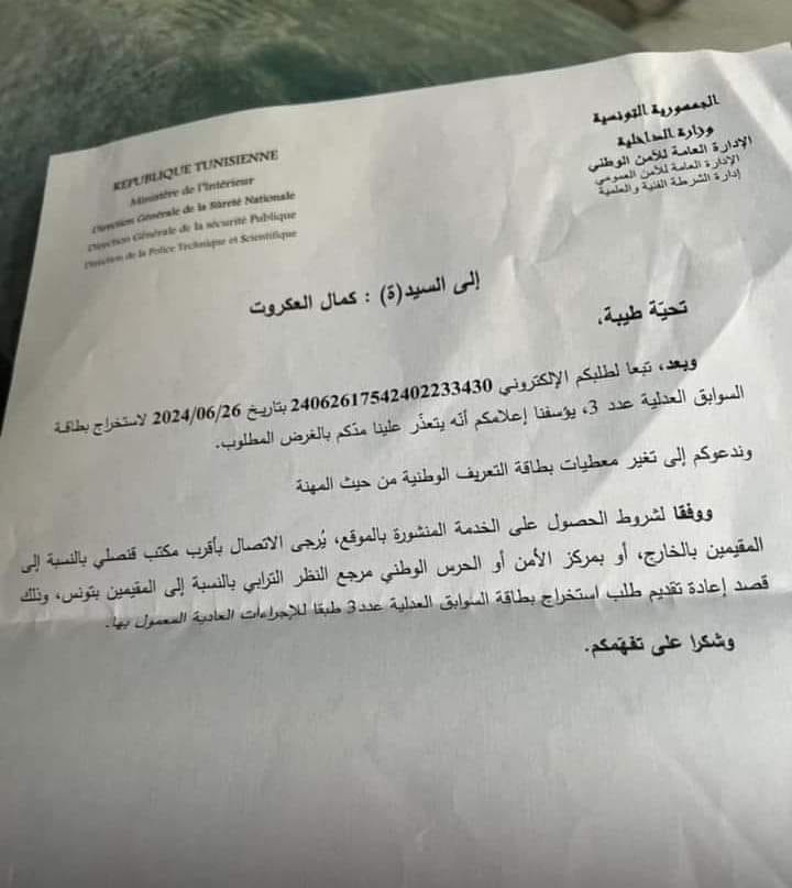 وقالت ذات المصادر بانه قد تعذر على الدوائر الرسمية تسليم بطاقة عدد3 للمترشح للانتخابات الرئاسية الأميرال كمال العكروت و بالتالي يسقط شرط من شروط الترشح.