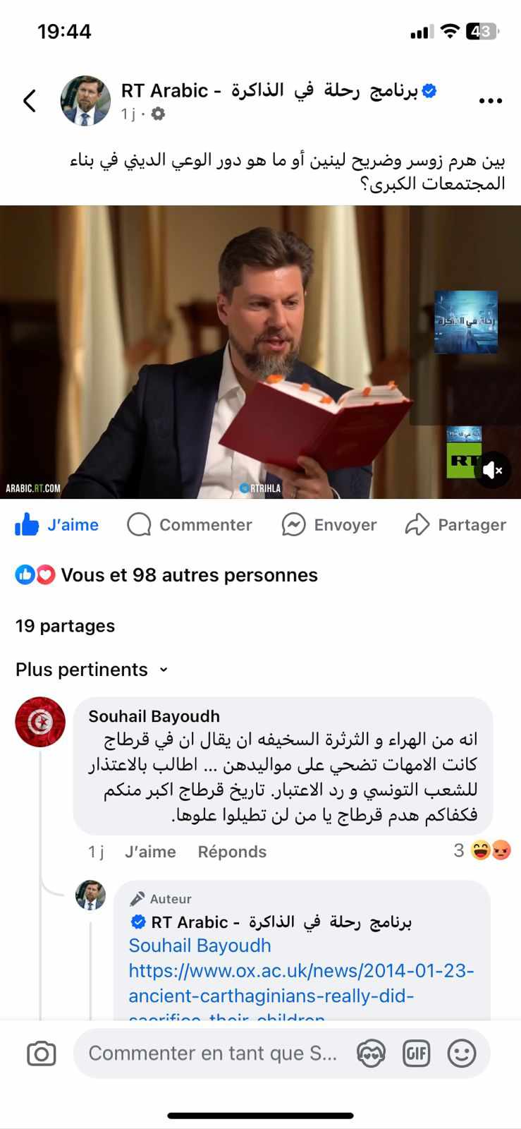 بثت قناة روسيا اليوم RT برنامجا وثائقيا تحت عنوان “رحلة في الذاكرة”، اذ تفوه ضيف الحصة في الدقيقة 24.25′ بتصريح خطير ومشوه لتونس شعبها وحضارة.