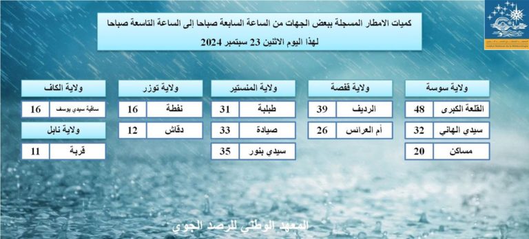 نشر المعهد الوطني للرصد الجوي كميات الامطار المسجلة ببعض الجهات من الساعة السابعة صباحا (07:00) إلى الساعة التاسعة صباحا (09:00) لهذا اليوم الاثنين 23 سبتمبر 2024 وفي ما يلي التفاصيل: