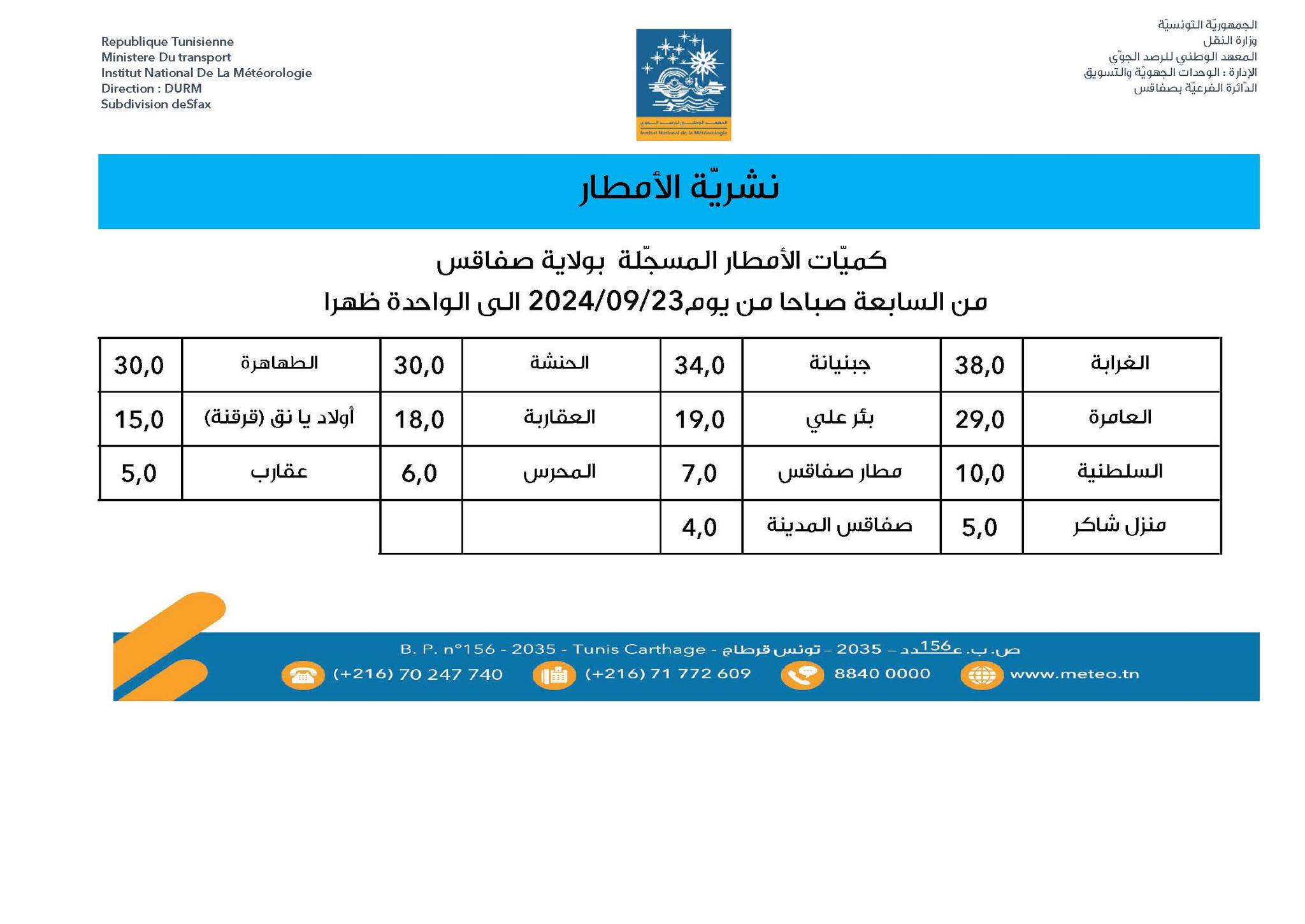 كميات الامطار المسجلة خلال هذا اليوم الاثنين 23 سبتمبر 2024 إلى غاية الساعة الواحدة ظهرا بولاية صفاقس: