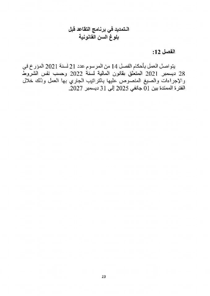 يُذكر أن قانون المالية لسنة 2022 كان قد أقر في فصله الرابع عشر برنامجاً خاصاً يتيح للأعوان العموميين تقديم طلب للتقاعد المبكر قبل بلوغهم السن القانونية، شريطة أن يكونوا قد بلغوا سن 57 سنة على الأقل خلال الفترة من 1 جانفي 2022 إلى 31 ديسمبر 2024، وأن يكونوا قد قضوا فترة العمل المشترطة للحصول على جراية التقاعد.