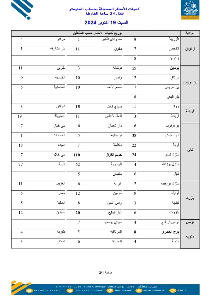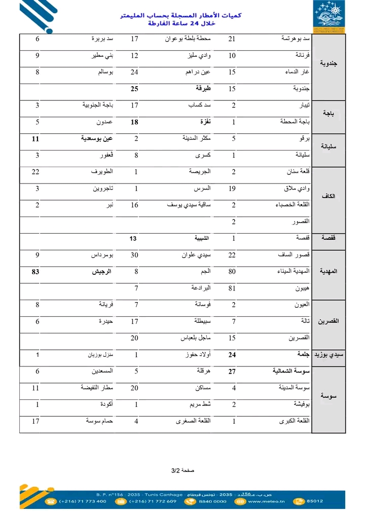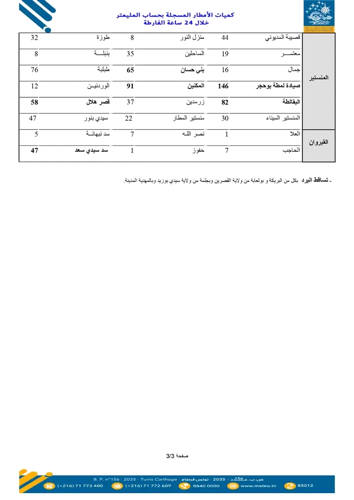 متفاوتة من الأمطار بأغلب ولايات الجمهورية حيث بلغت اقصاها 146 ملم بمناطق صيادة لمطة بوحجر من ولاية المنستير وفق المعهد الوطني للرصد الجوي