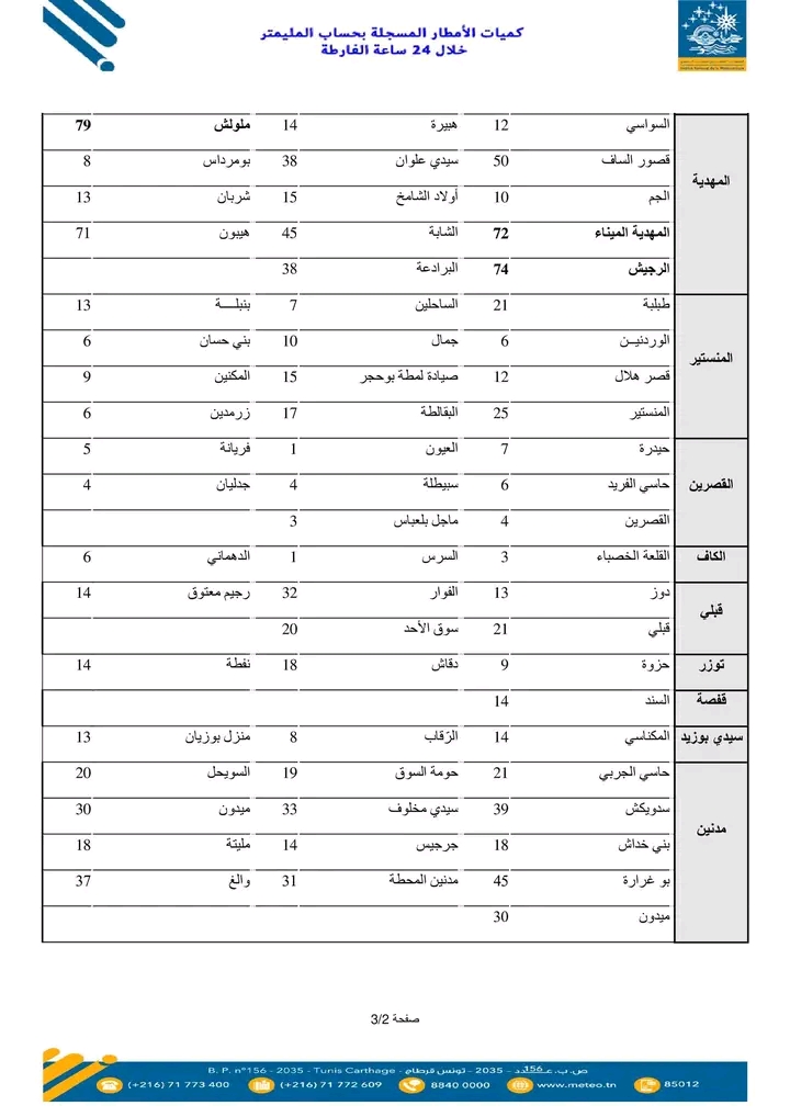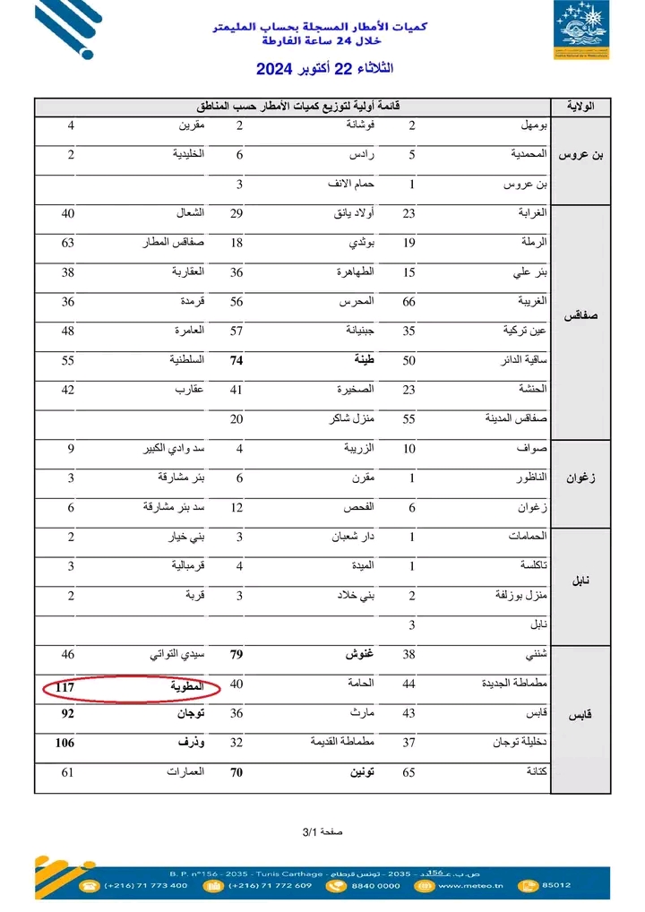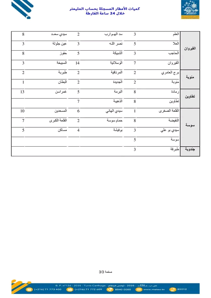 نشر المعهد الوطني للرصد الجوي قائمة أوّلية لكميّات الأمطار المسجلة خلال 24 ساعة الفارطة ( من الساعة 07:00 ليوم 21أكتوبر إلى الساعة 07:00 ليوم 22أكتوبر 2024) : وفيما يلي الكميات المسجلة بالمليمتر: