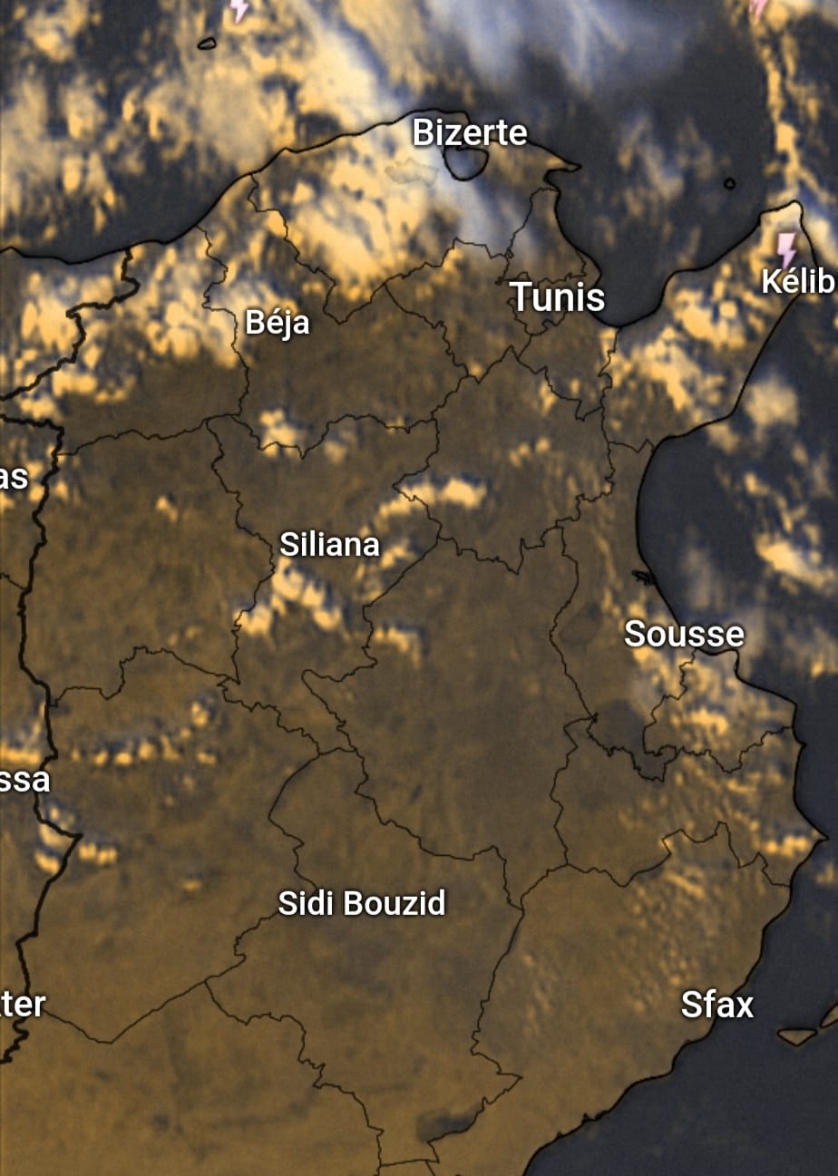 تشهد حالة الطقس مساء اليوم تطورات مهمة خلال الساعات القادمة، ووفقاً لأخر صور الأقمار الإصطناعية فهناك سحب ركامية رعدية ترافقها عوارض غزيرة بأجزاء من ولاية نابل … كما تتواجد سحب رعدية بأجزاء من ولاية بنزرت . سحب ركامية متراكمة بجهات من القصرين وسليانة وجهة الساحل…