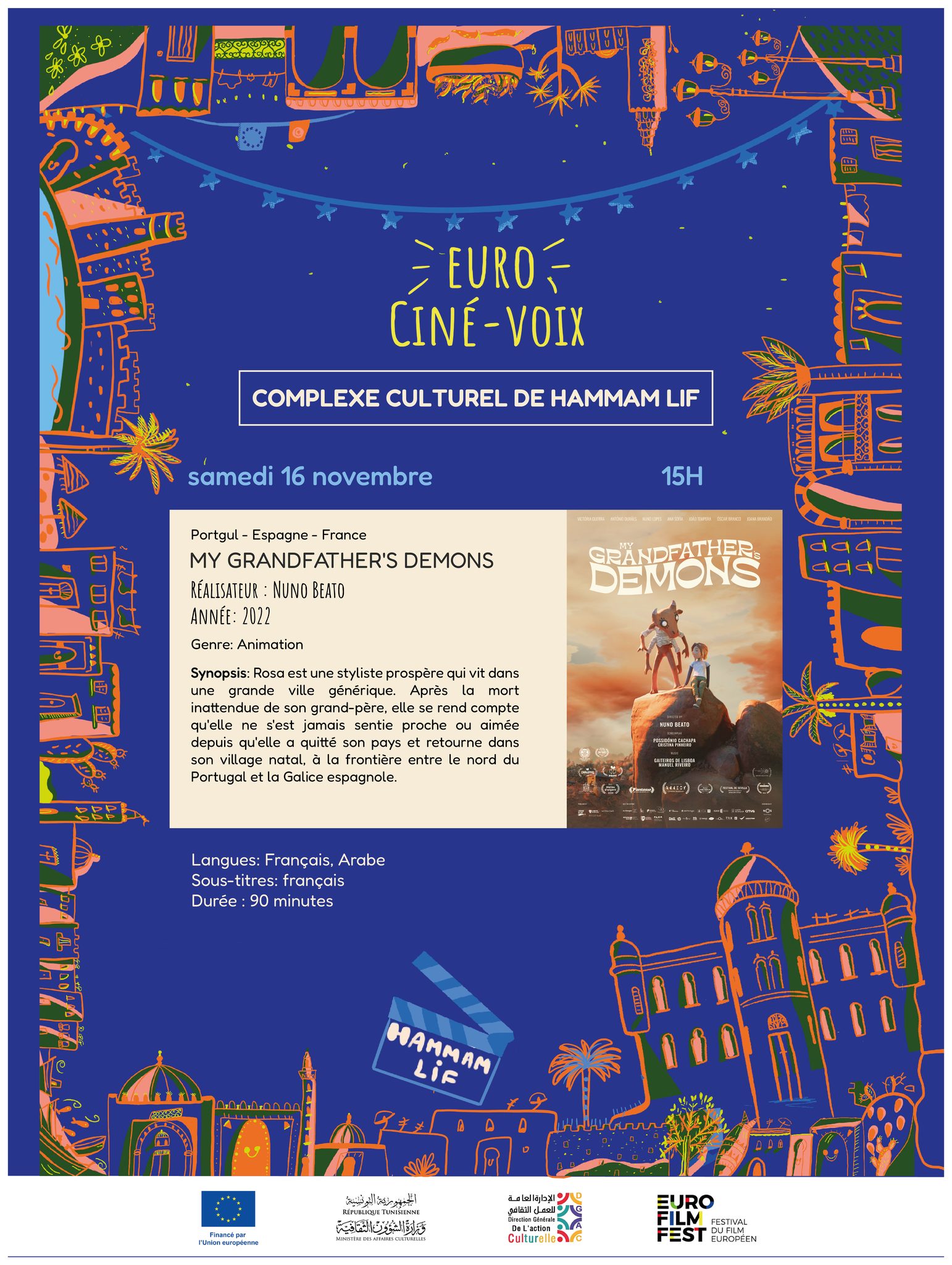الموعــد سيكون يوم السبت 16 نوفمبر 2024 على الساعة 15:00 بالمركب الثقافي علي بن عايد بحمام الأنف من اجل إكتشاف فيلم الرسوم المتحركة “شياطين جدي” للمخرج نونو باتو.