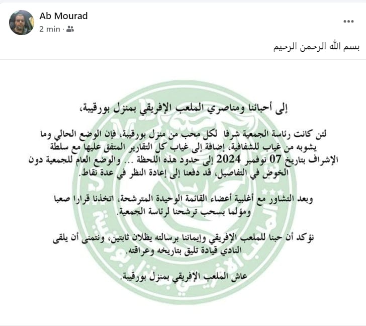 وفي وقت سابق، أعلنت قائمة مراد العباسي عن التراجع في الترشح لرئاسة الملعب الإفريقي بمنزل بورقيبة.