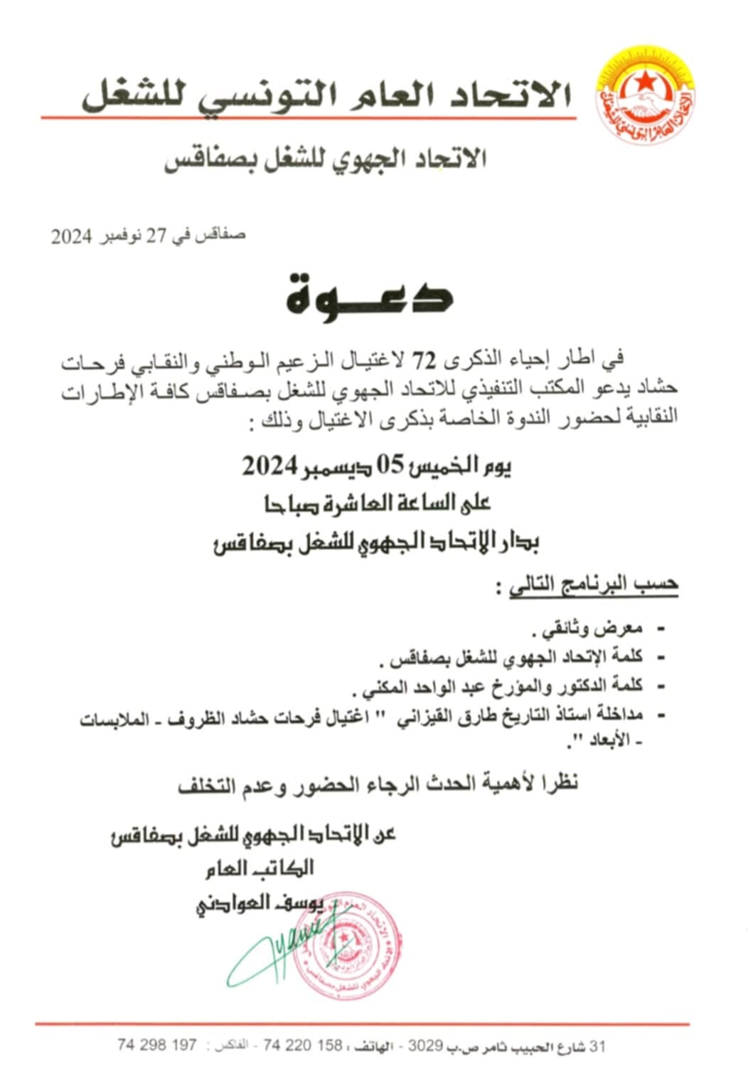 في إطار إحياء الذكـرى 72 لإغتيال الزعيم الوطني والنقابي فرحات حشاد دعا المكتب التنفيذي للإتحاد الجهوي للشغل بصفاقس كافة الإطارات النقابية لحضور الندوة الخاصة بذكرى الإغتيال وذلك يوم الخميس 5 ديسمبر 2024 بدار الإتحاد بصفاقس.