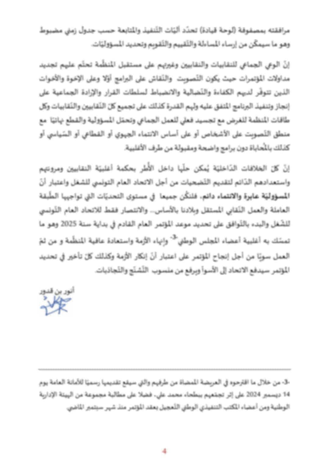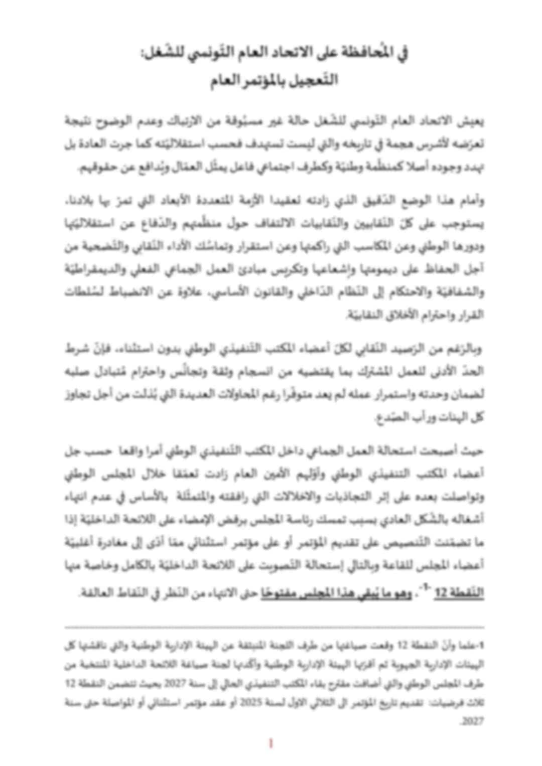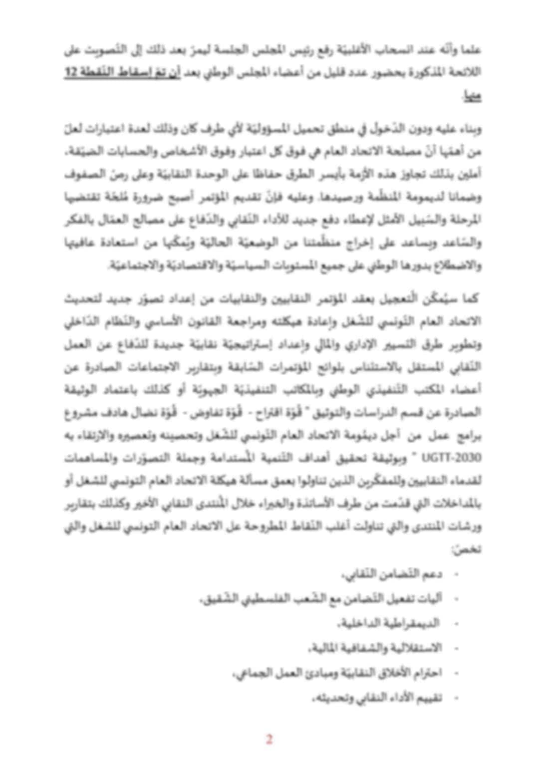 دعا الامين العام المساعد انور بن قدور بعقد مؤتمر للاتحاد العام التونسي للشغل بداية العام القادم وأعتبر ذلك هو الحل الوحيد للحفاظ على وحدة الاتحاد.