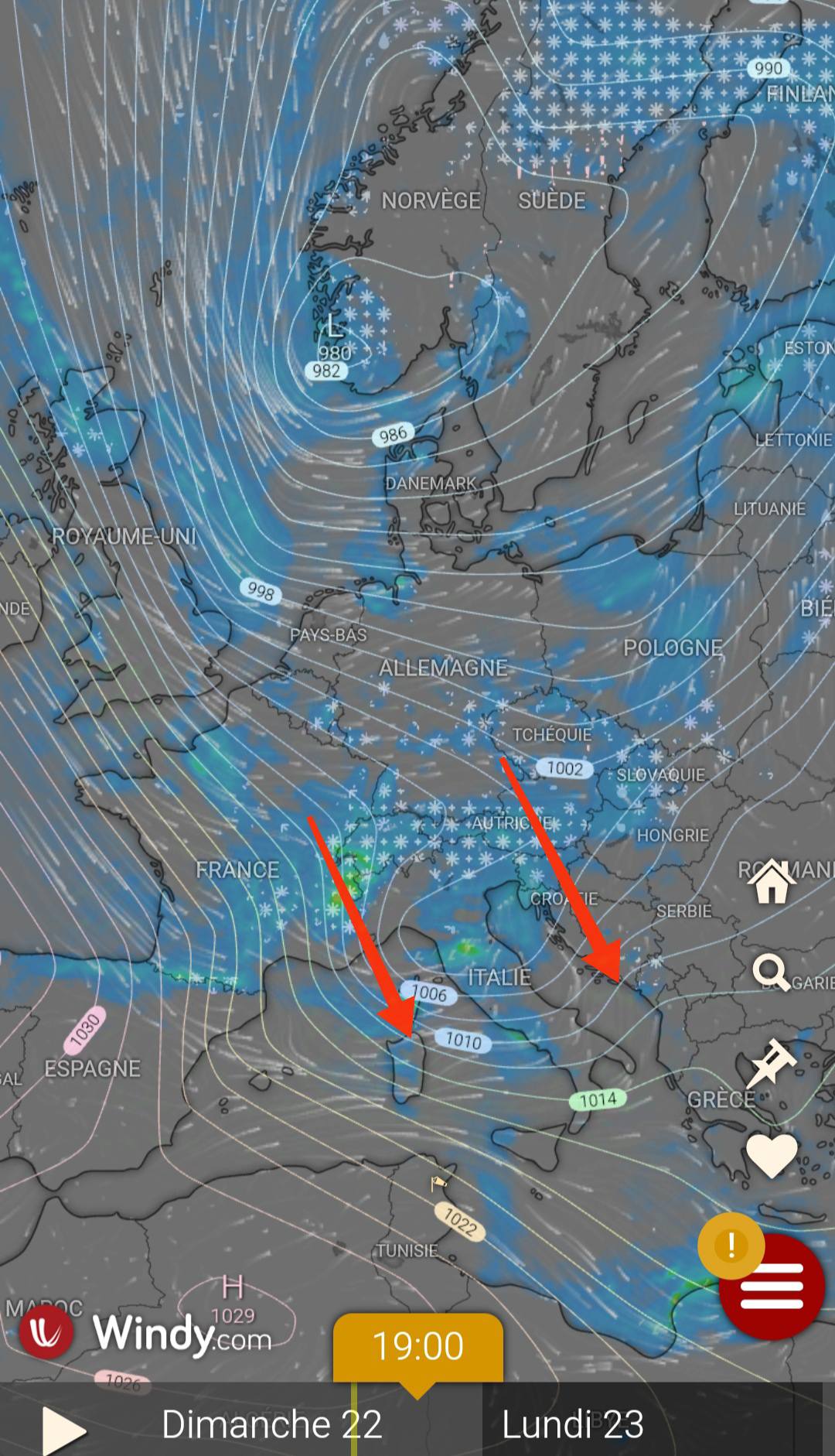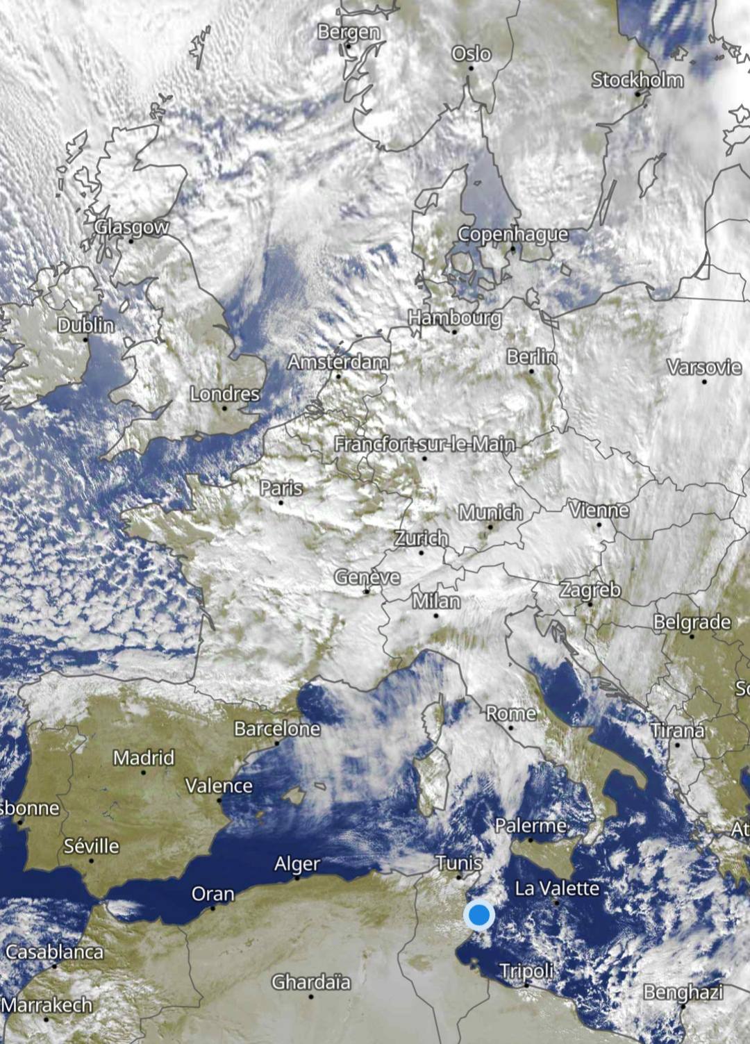 المنخفض الأن الأحد 22 ديسمبر في فرنسا و ألمانيا و سويسرا و النمسا مع الأمطار و الثلوج….في اتجاه ايطاليا و شمال تونس و شمال شرق الجزائر و السواحل الليبية.