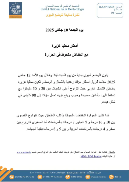يكون الوضع الجوي بداية من يوم غد السبت ليلا وخلال يوم الأحد 12 جانفي 2025 ملائما لنزول أمطار مؤقتا رعدية بالشمال والوسط وتكون محليا غزيرة بمناطق الشمال الغربي حيث تتراوح أعلى الكميات بين 30 و 50 مليمترا مع تساقط البرد بأماكن محدودة وهبوب رياح قوية تصل مؤقتا إلى 90 كلم في الساعة في شكل هبّات.