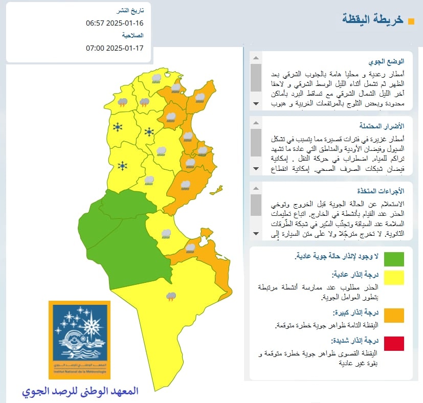 خريطة اليقظة الصادرة عن المعهد الوطني للرصد الجوي للفترة من اليوم الخميس 16 جانفي 2025 س7 إلى يوم الغد الجمعة 17 جانفي 2025 س7.